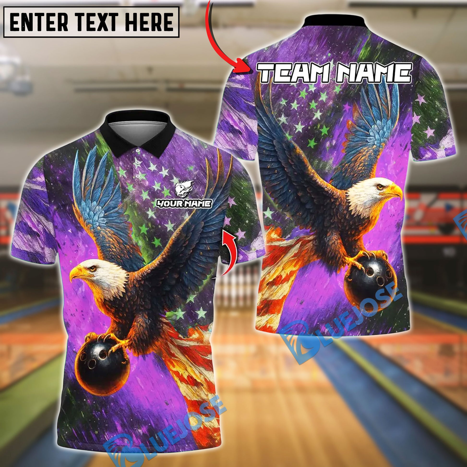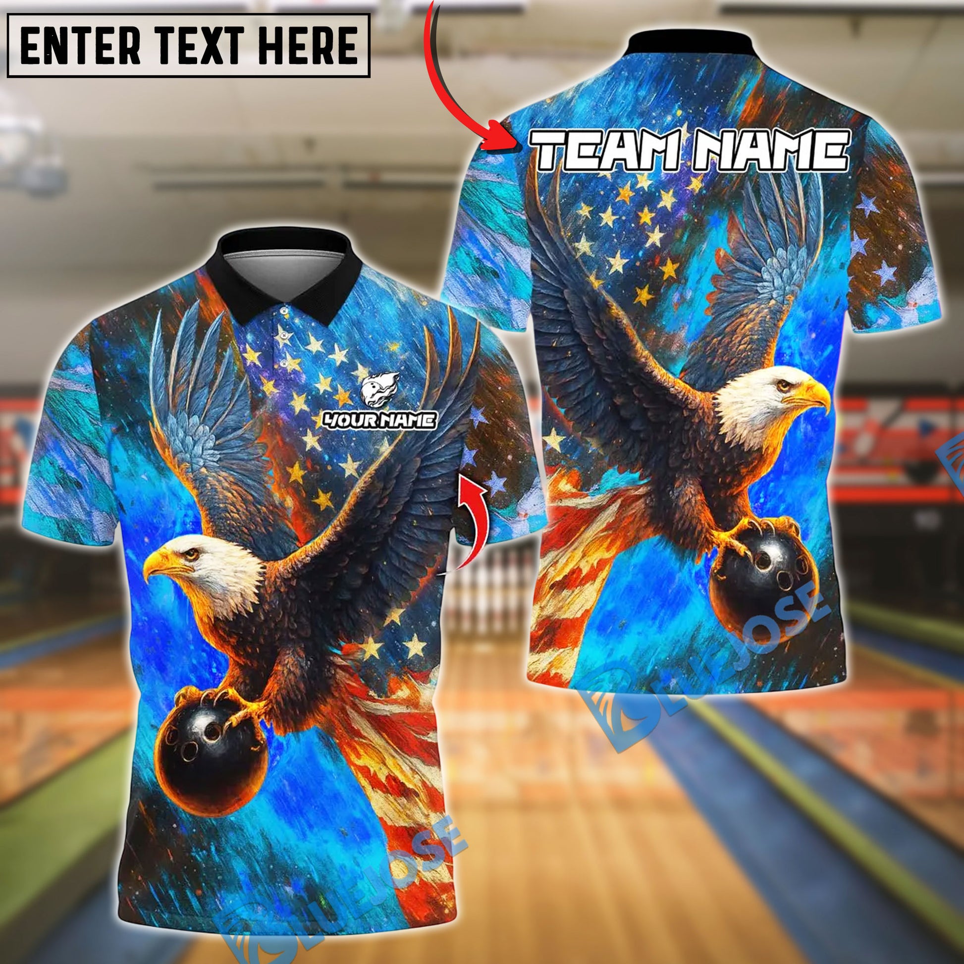 BlueJose Bowling And Pins Sky Eagle US Flag Customized Name, Team Name 3D Shirt (4 Colors)