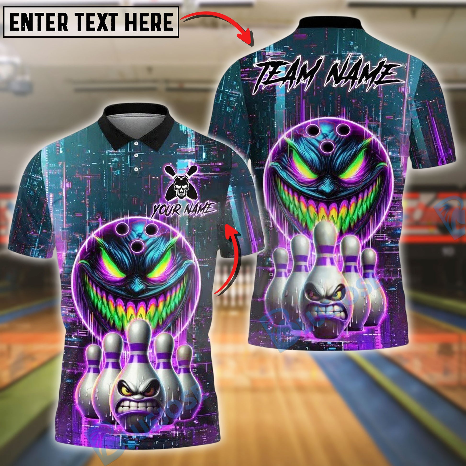 BlueJose Bowling And Pins Tech Monster Customized Name, Team Name 3D Shirt (4 Colors)