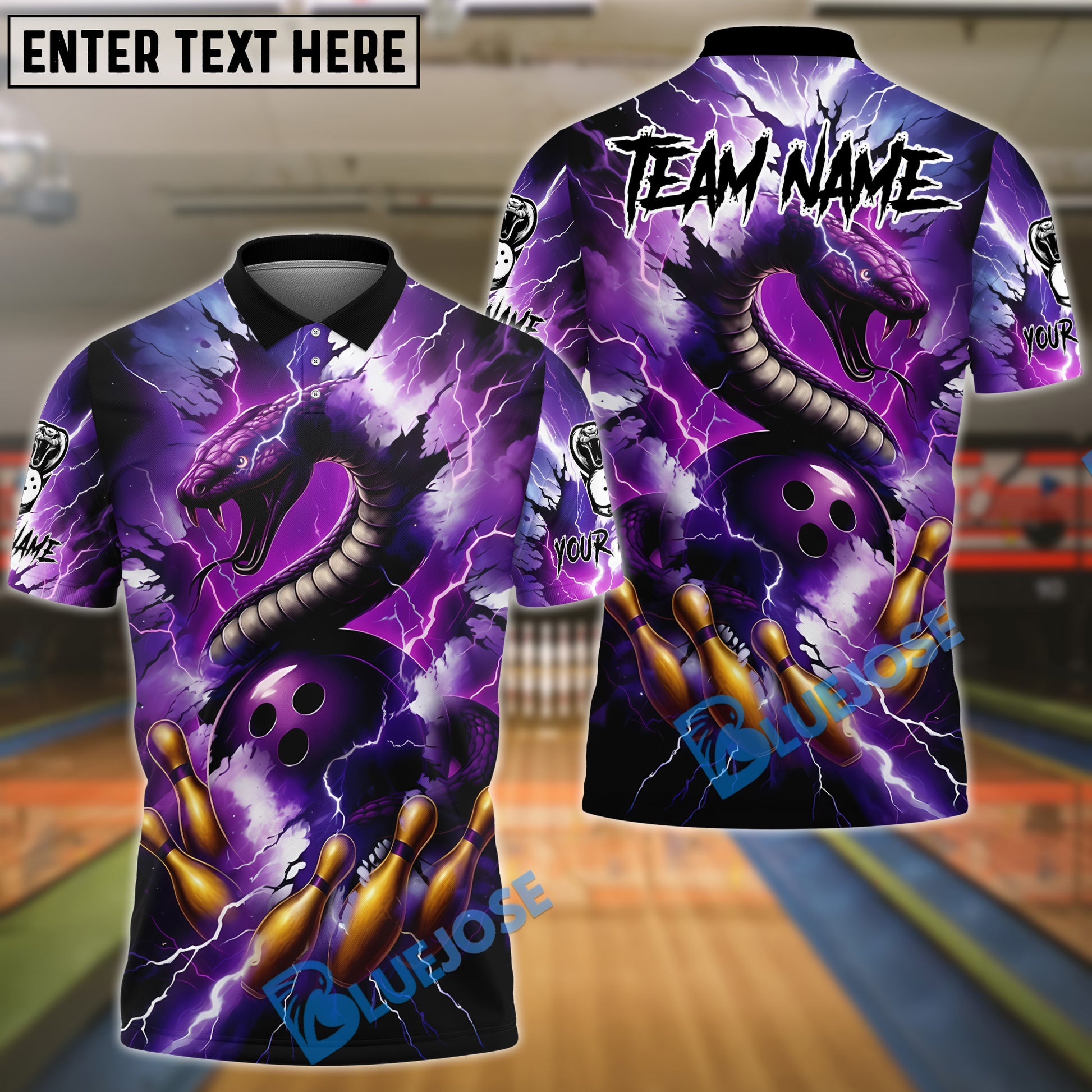 BlueJose Bowling And Pins Thunder Lightning Cobra Snake Customized Name, Team Name 3D Shirt (4 Colors)