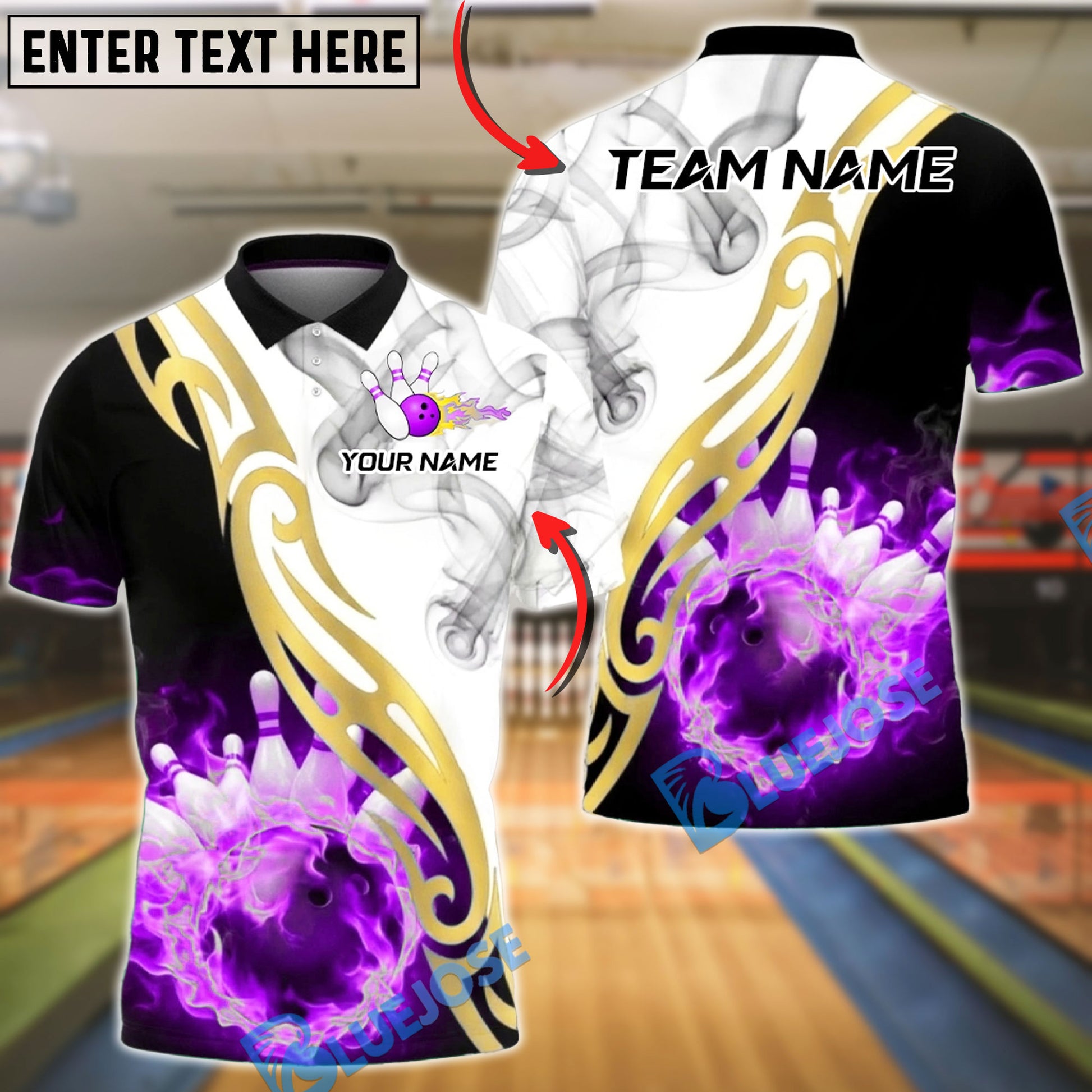 BlueJose Bowling And Pins White Fire Smoke Golden Tribal Customized Name, Team Name 3D Shirt (4 Colors)