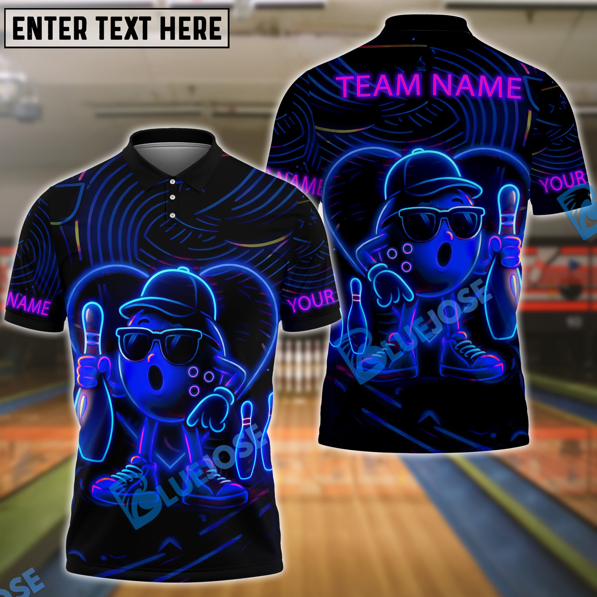 BlueJose Bowling Ball & Pins Neon Funny Customized Name, Team Name 3D Shirt (4 Colors)