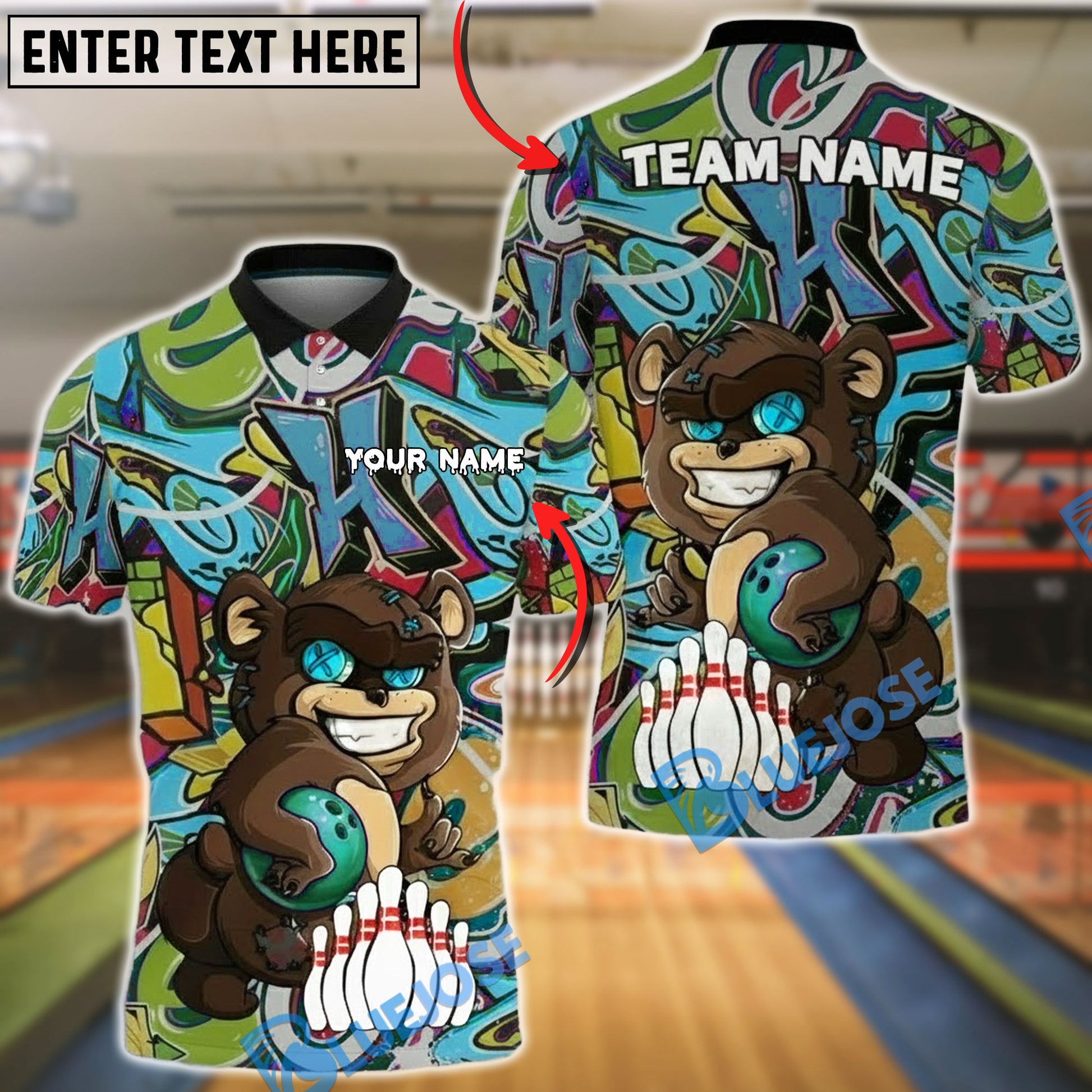 BlueJose Bowling Bear Cartoon Graffiti Style Customized Name, Team Name 3D Shirt (4 Colors)
