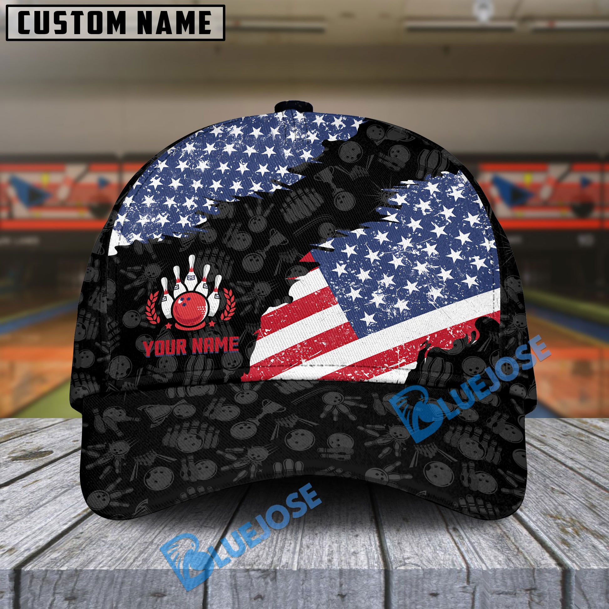 BlueJose Bowling Black US Flag Bowling Pattern Personalized Name Cap