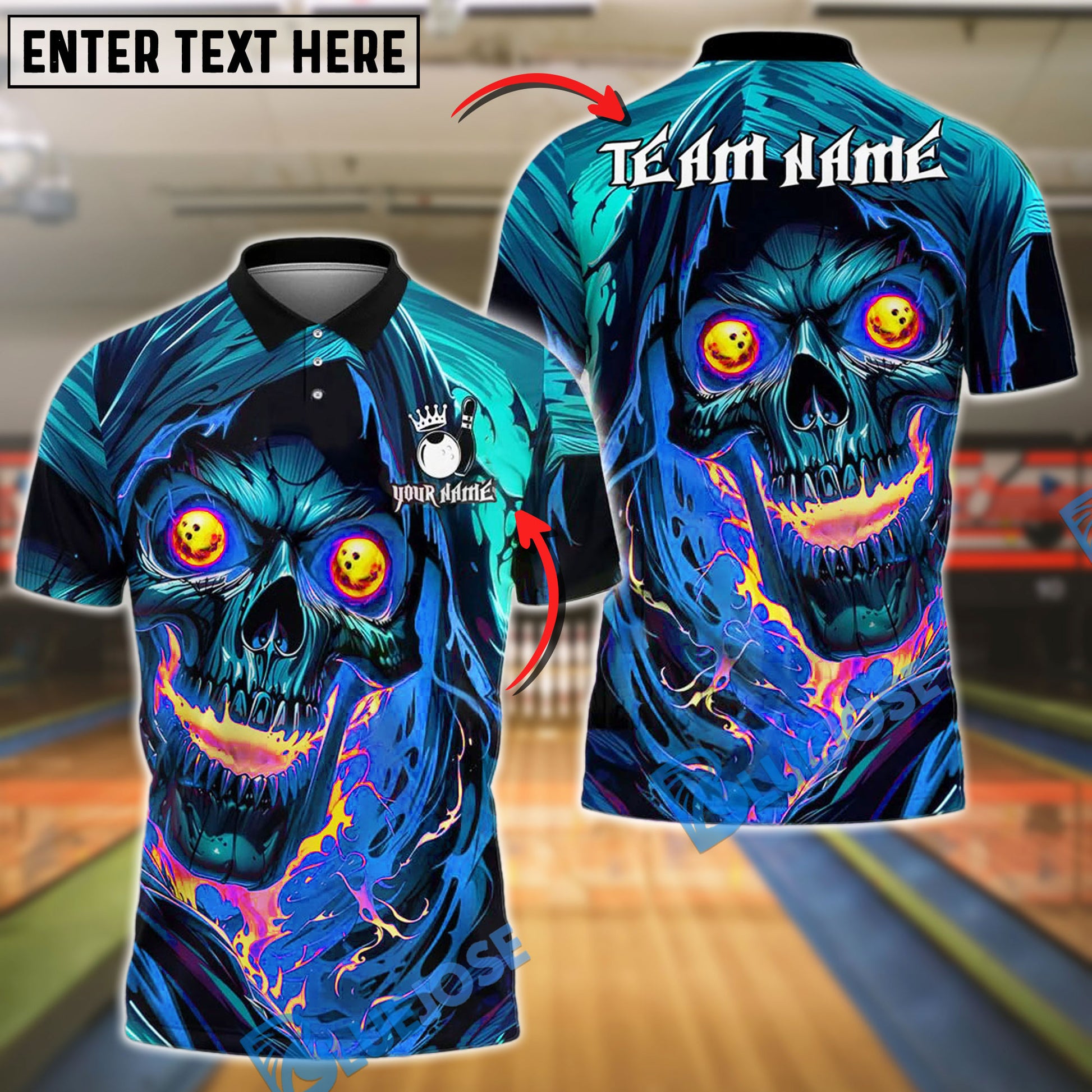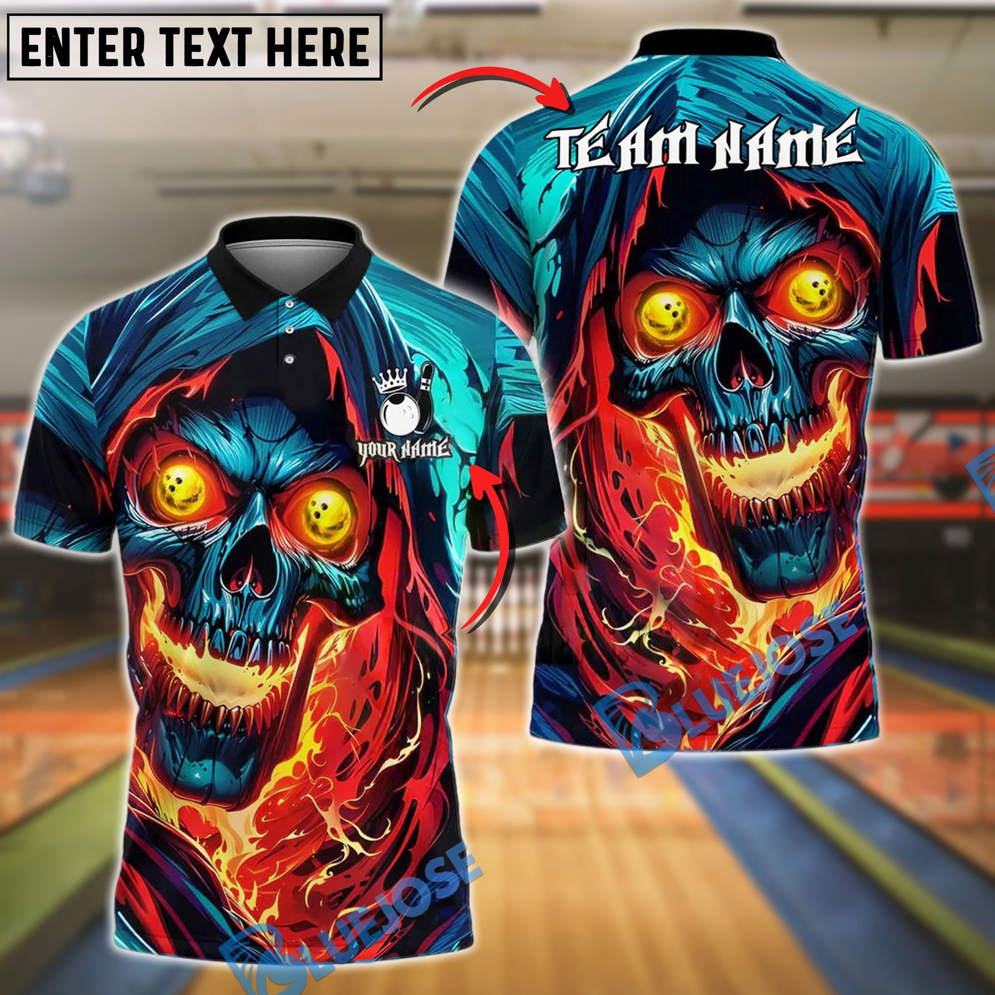 BlueJose Bowling Fiery Inferno Skull With Glowing Eyes Customized Name, Team Name 3D Shirt (4 Colors)