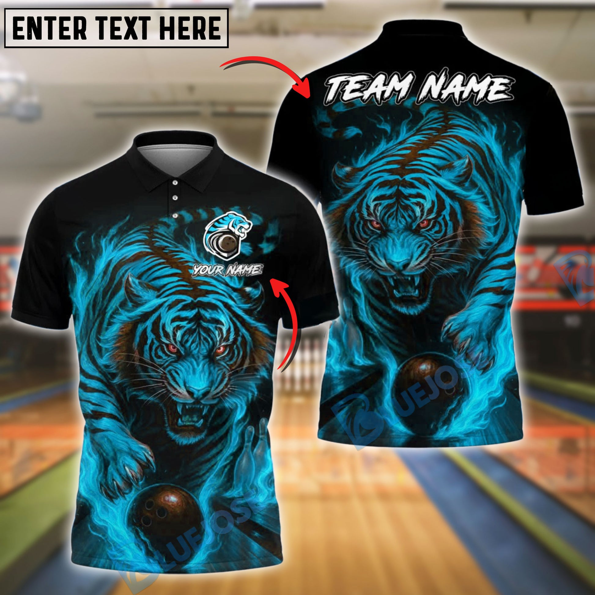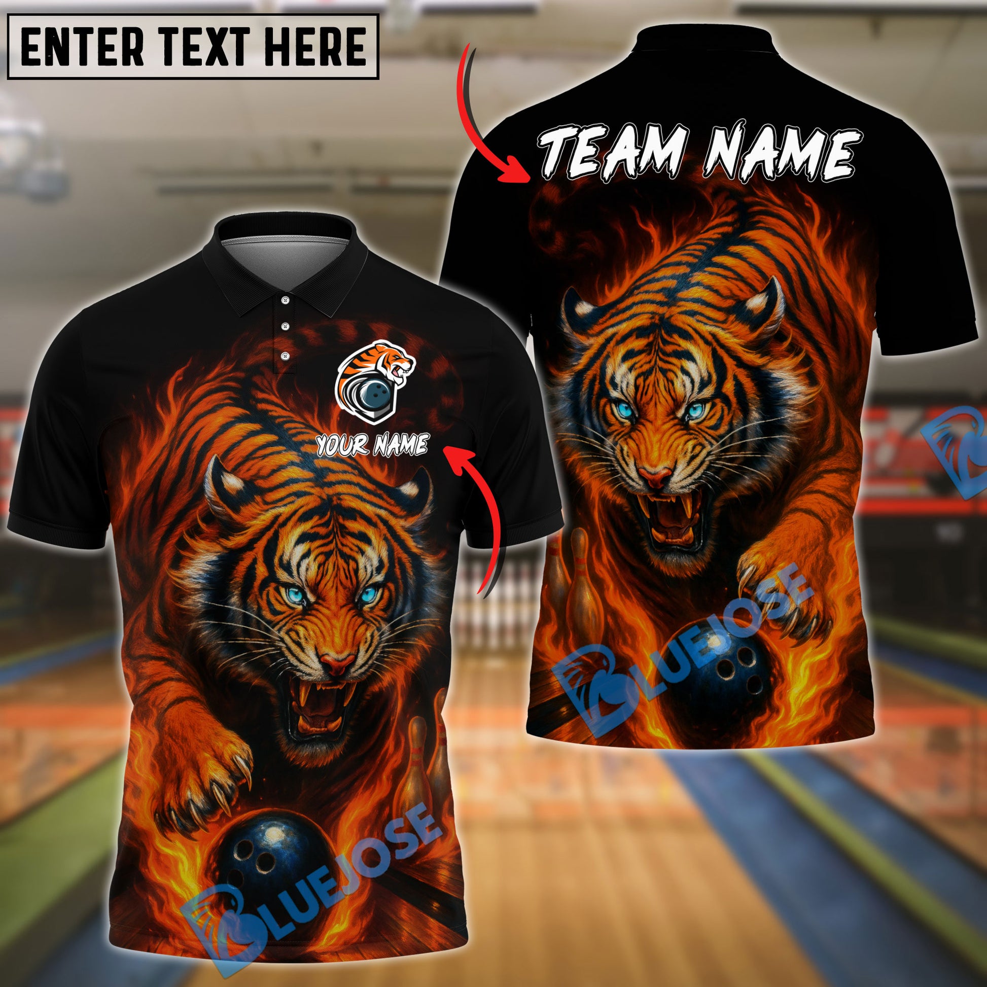 BlueJose Bowling Fiery Tiger Bowling Ball Flames Customized Name, Team Name 3D Shirt (4 Colors)