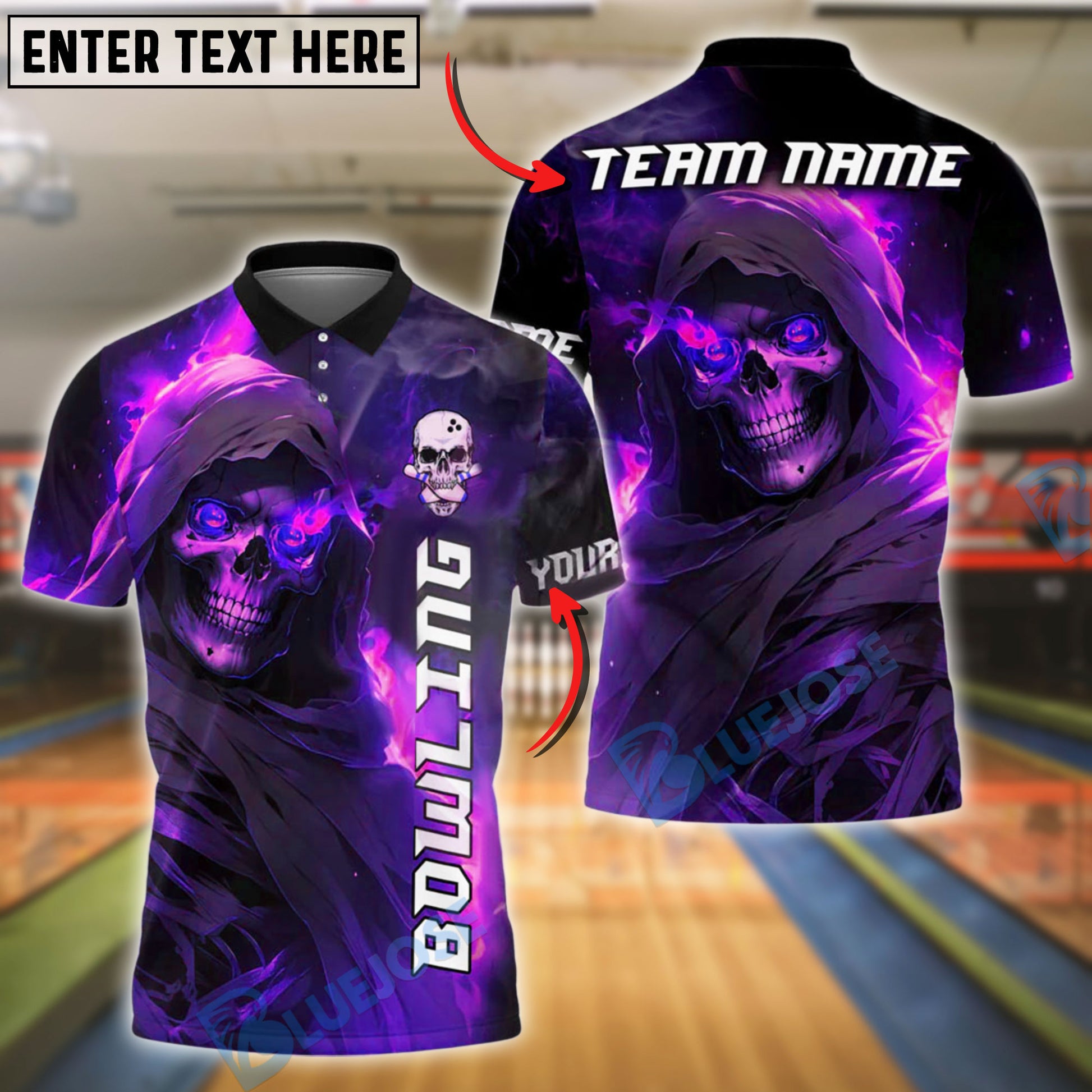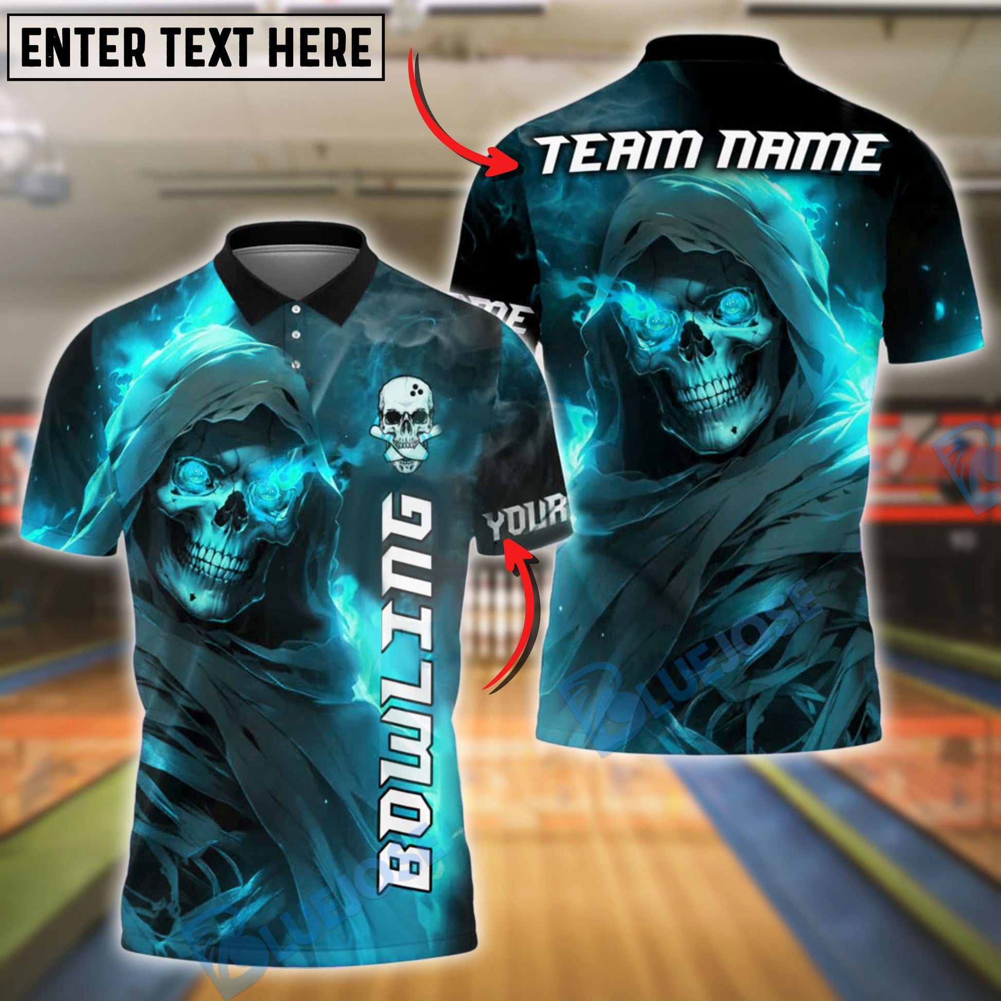 BlueJose Bowling Flaming Skull Fire Reaper Customized Name, Team Name 3D Shirt (4 Colors)