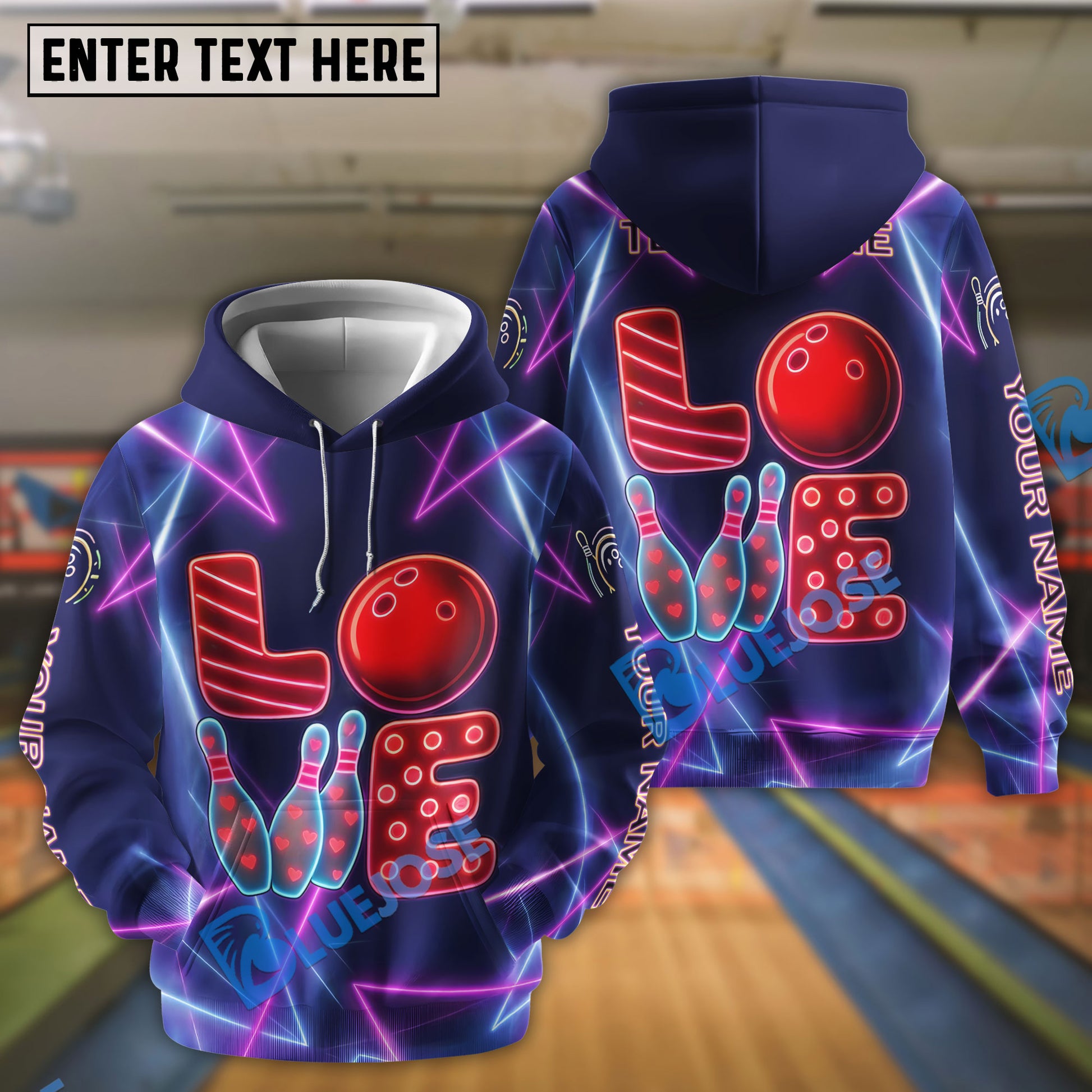 BlueJose Bowling LOVE With Pins And Ball In Neon Design Customized Name, Team Name 3D Shirt