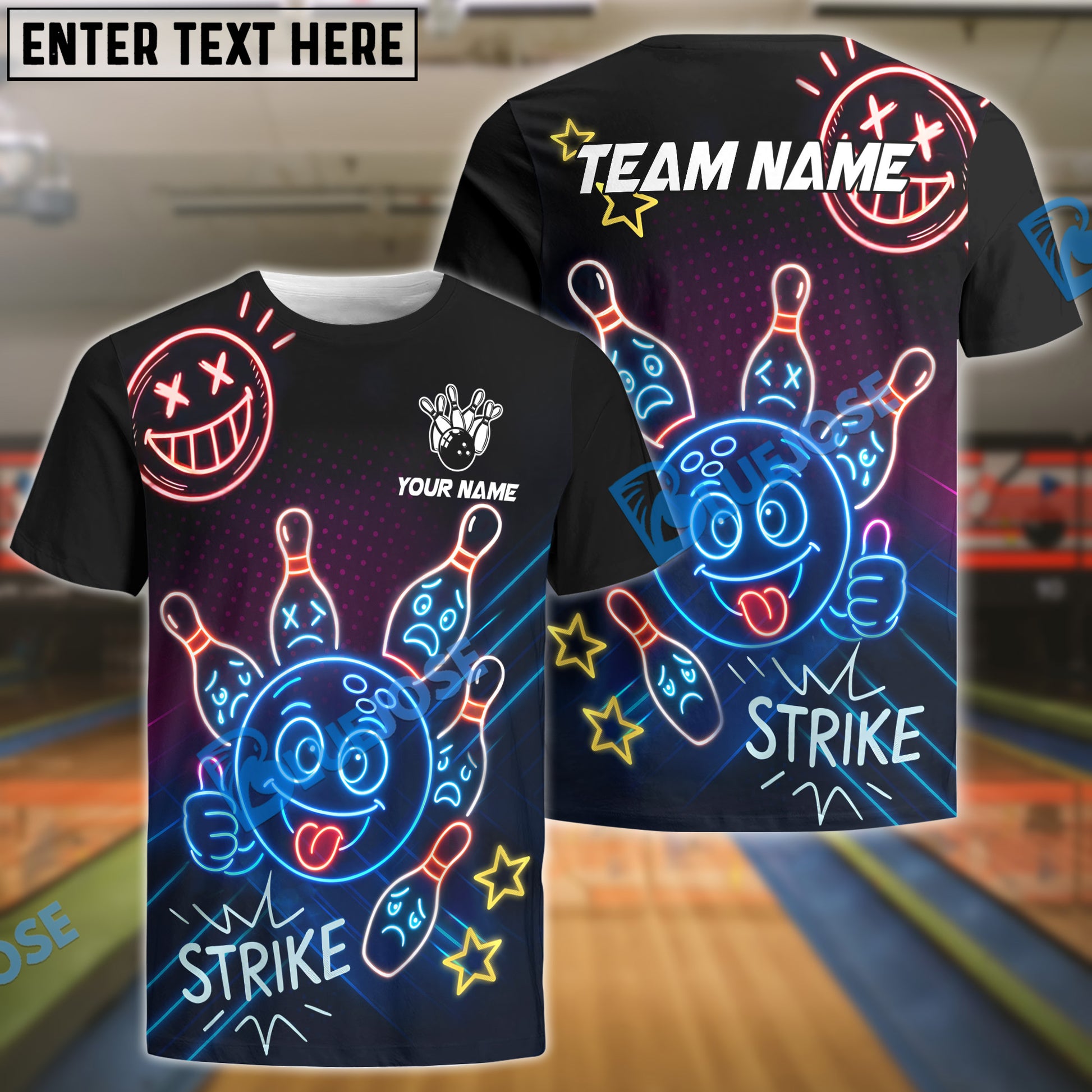 BlueJose Bowling Neon Bowling Ball Strike Funny Customized Name, Team Name 3D Shirt (4 Colors)