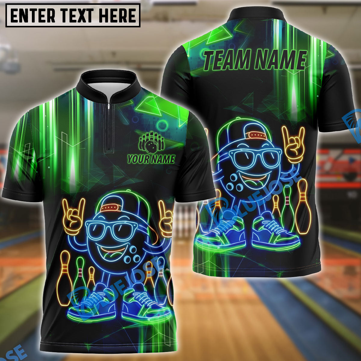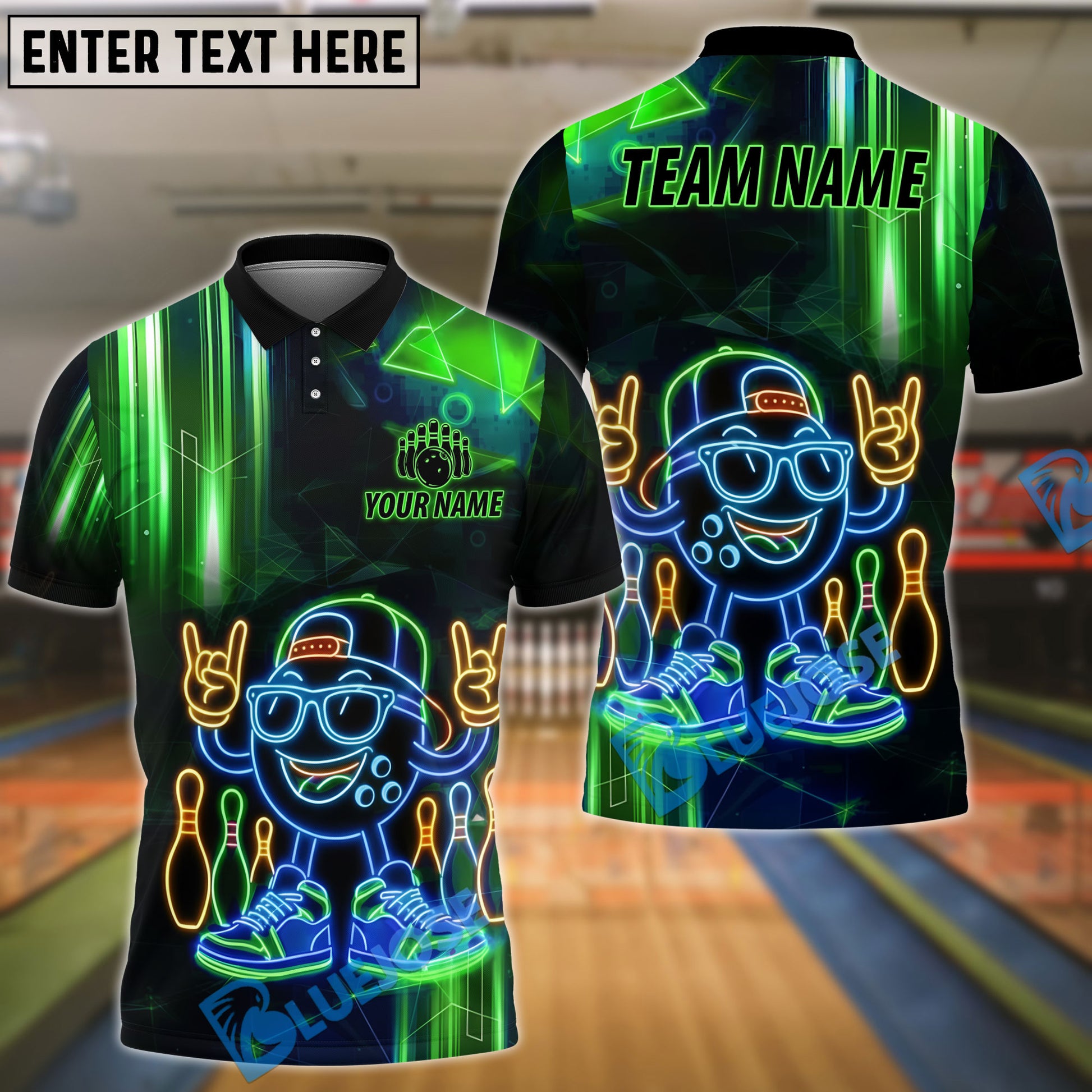 BlueJose Bowling Neon Cartoon Ball Cyber Glow Customized Name, Team Name 3D Shirt (4 Colors)