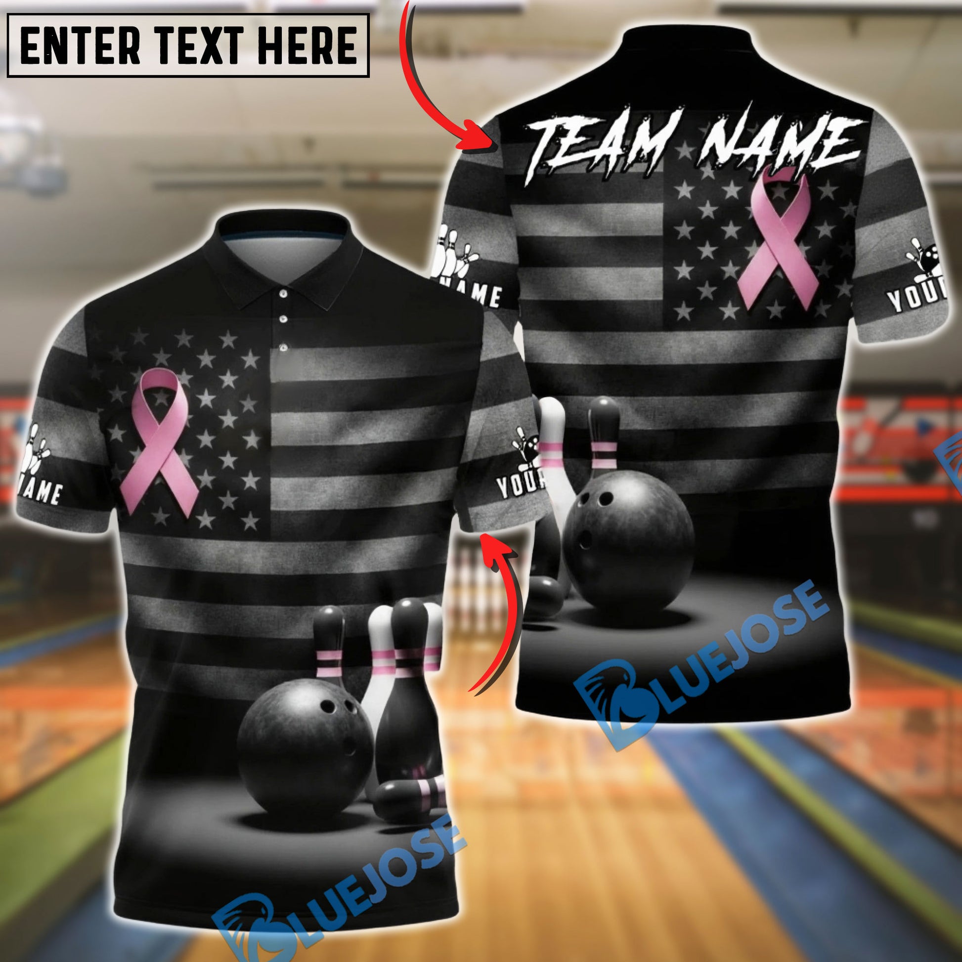 BlueJose Bowling Pink Ribbon USA Flag Cancer Personalized Name, Team Name 3D Shirt