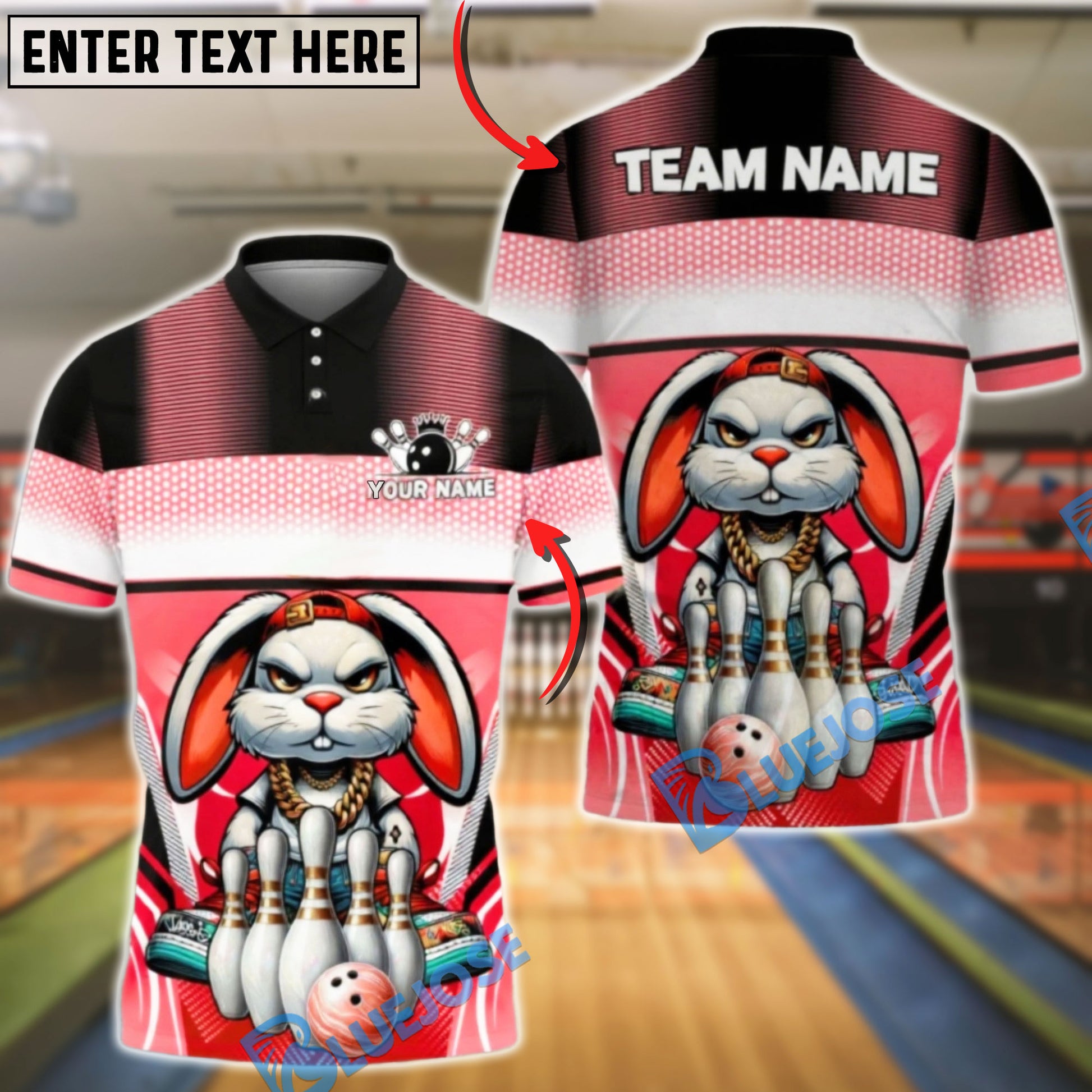 BlueJose Bowling & Pins Bunny Gangster Style Cartoon Graphic Customized Name, Team Name 3D Shirt (4 Colors)