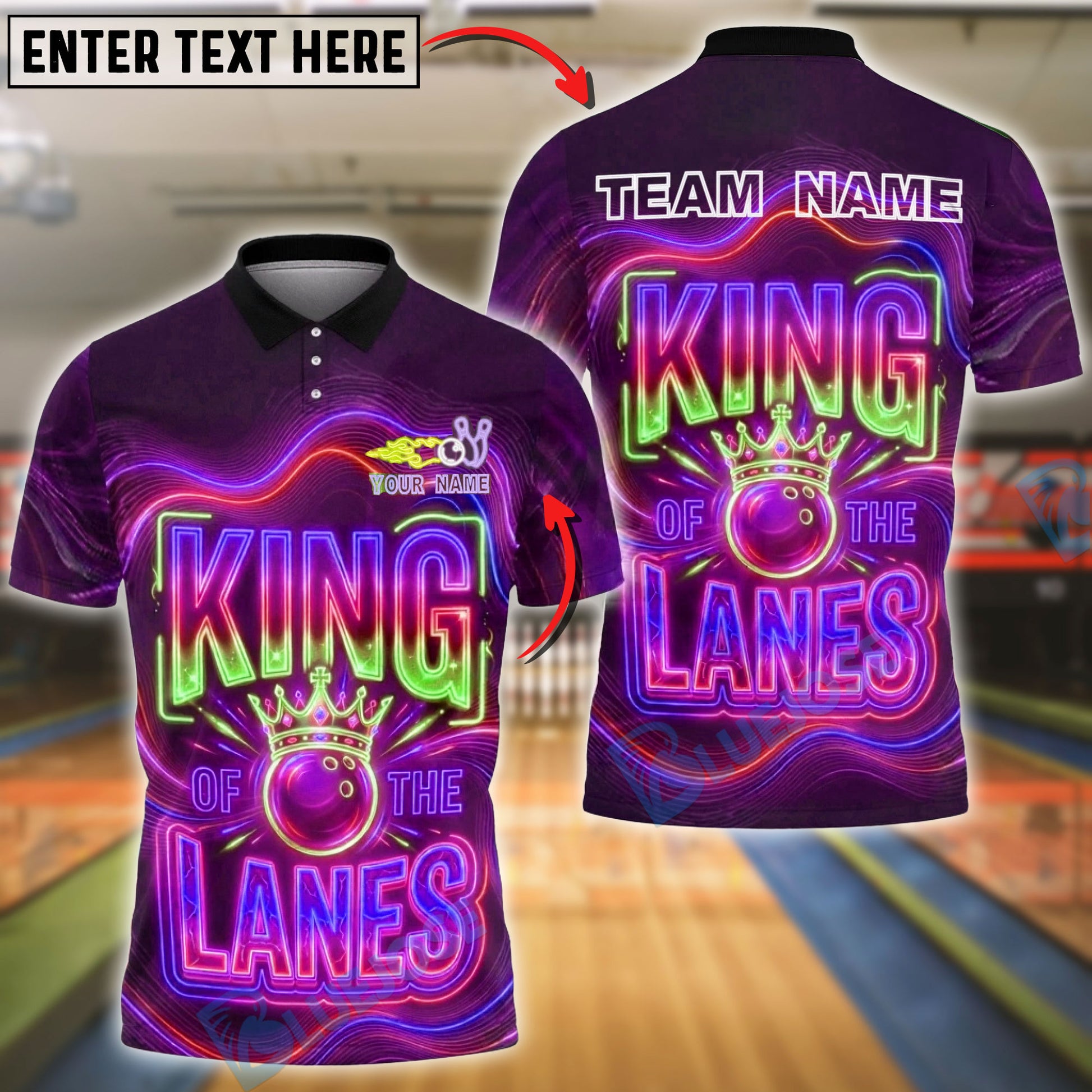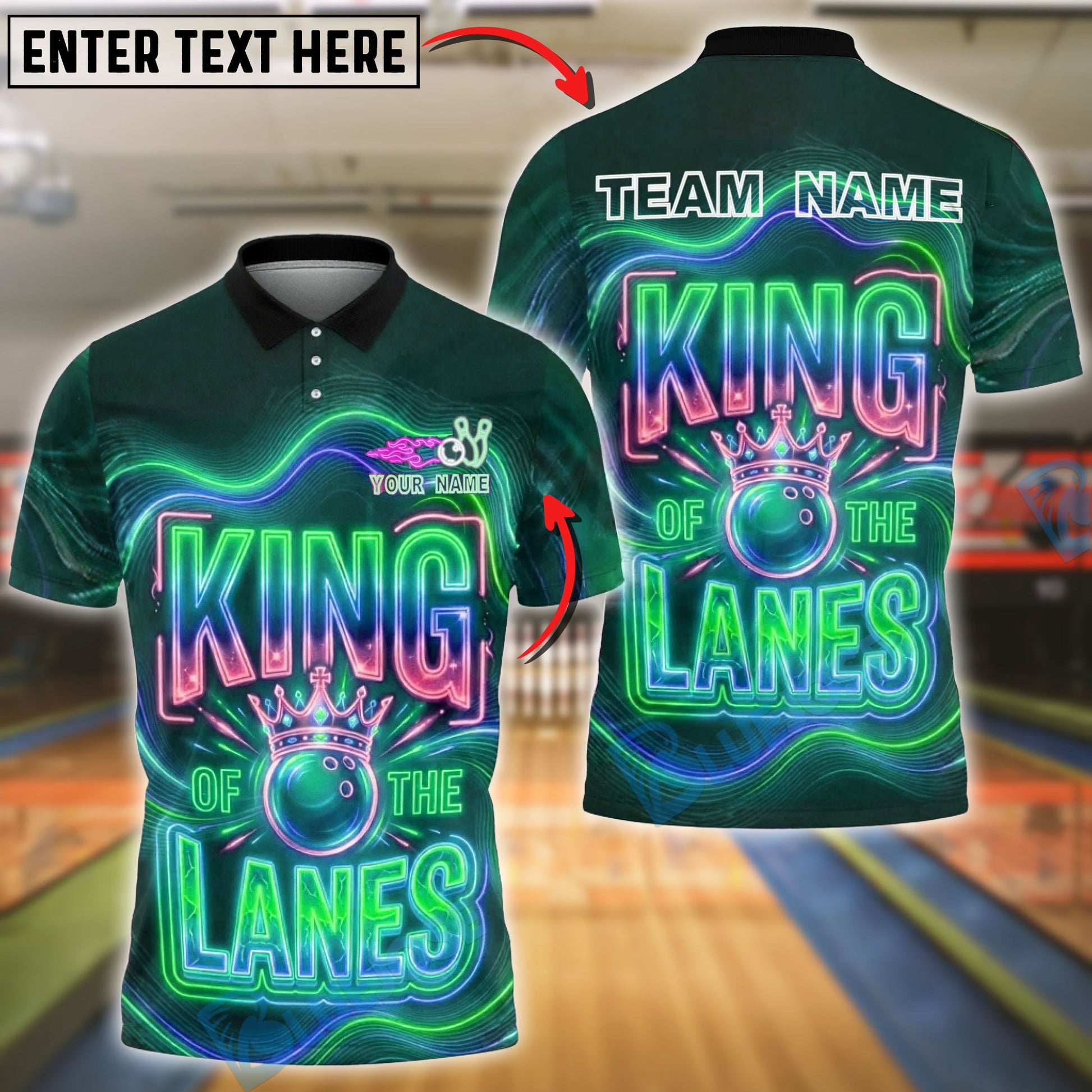BlueJose Bowling & Pins Neon King of the Lanes Typography Graphic Customized Name, Team Name 3D Shirt (4 Colors)