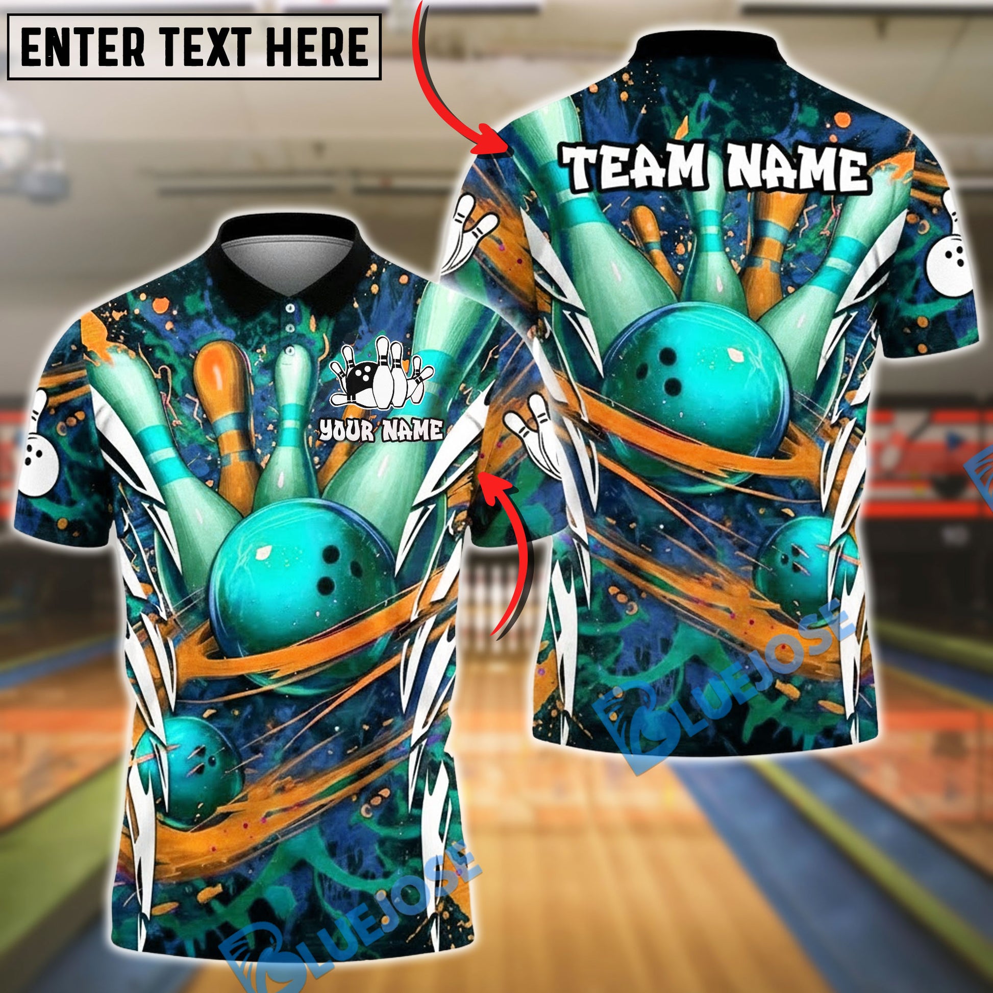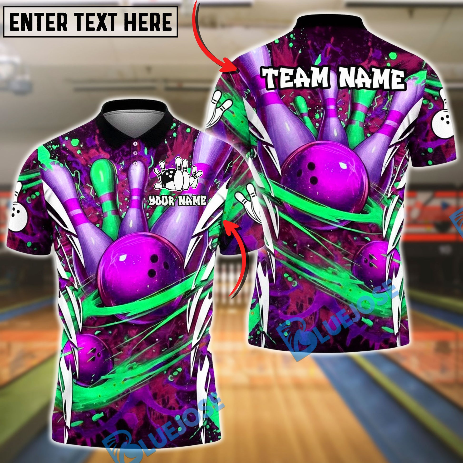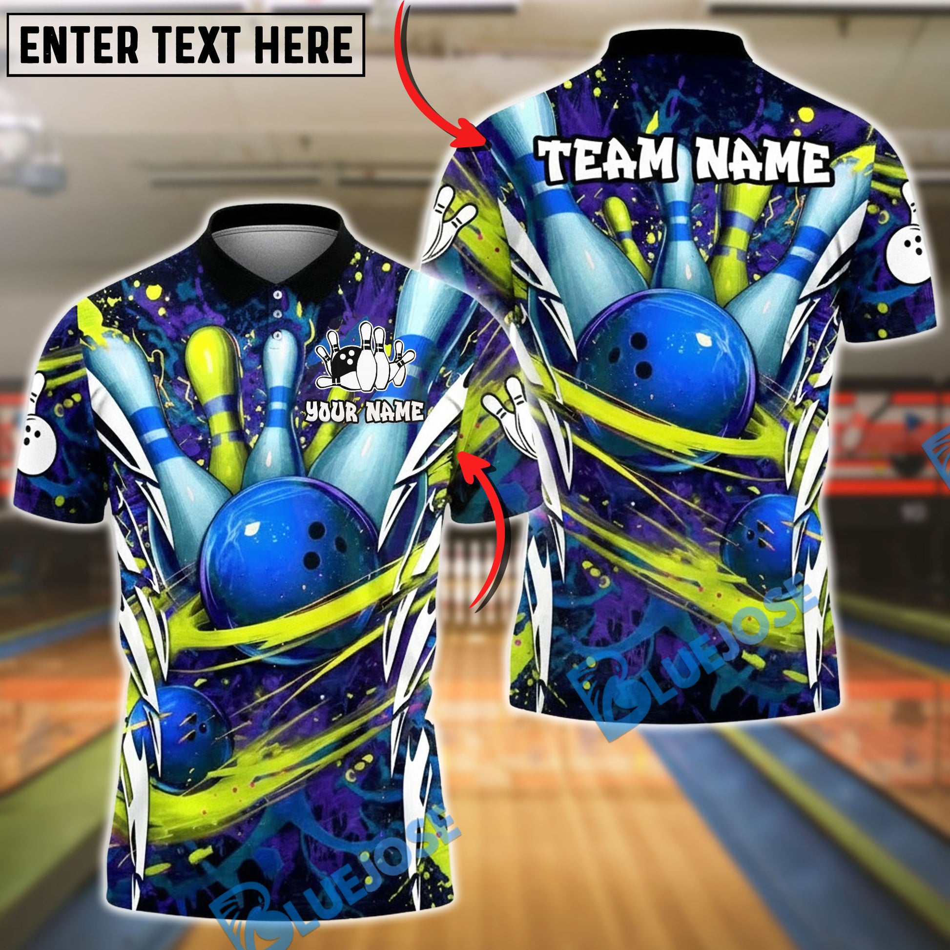 BlueJose Bowling & Pins Neon Splash Art Customized Name, Team Name 3D Shirt (4 Colors)