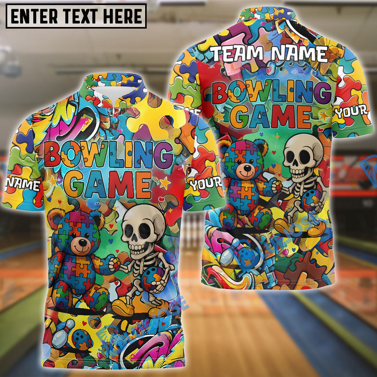 BlueJose Bowling Skull And Bear Colorful Puzzle Cartoon Autism Awareness Personalized Name, Team Name Unisex Shirt