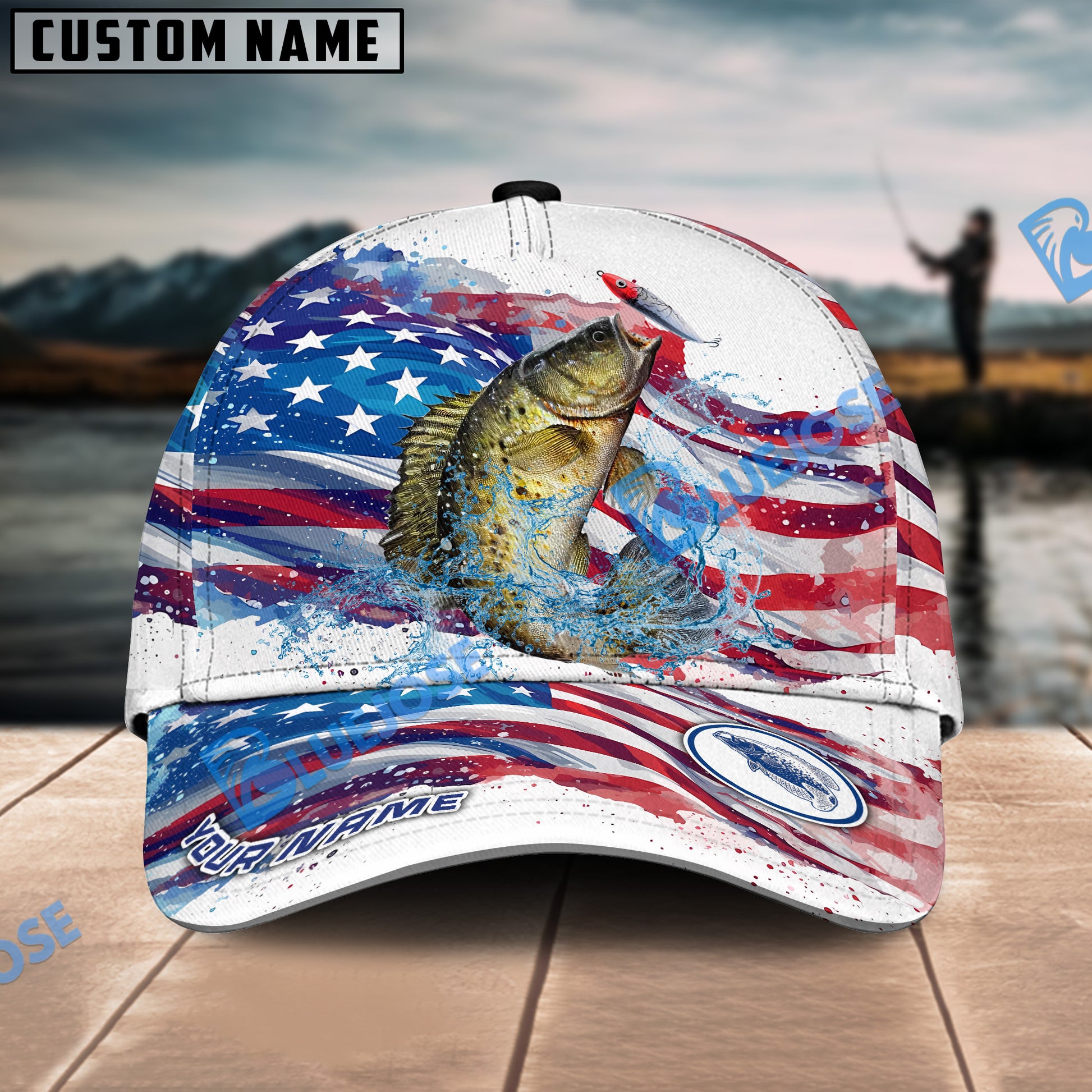 BlueJose Crappie Fishing Watercolor USA Flag Personalized Cap