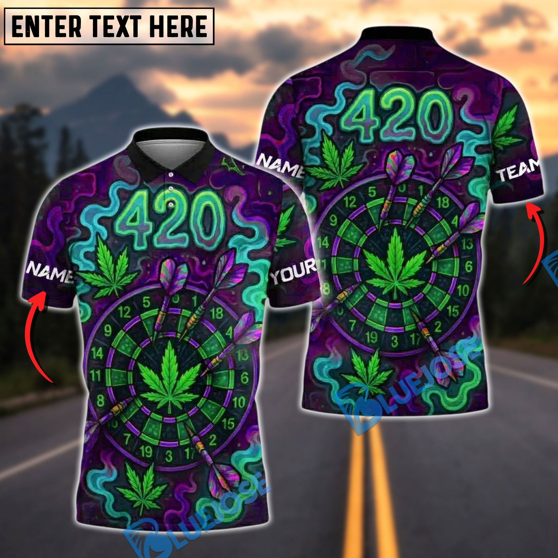 BlueJose Darts 420 Neon Cannabis Dartboard Glow Personalized Name, Team Name Unisex Shirt (4 Colors)