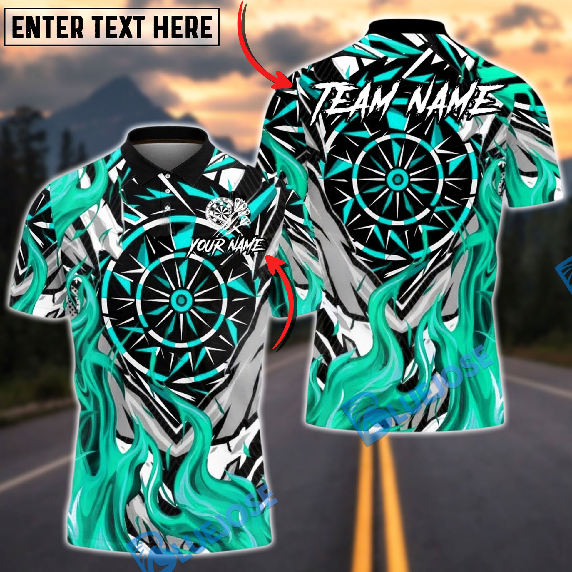 BlueJose Darts Abstract Flames with Geometric Dartboard Pattern Personalized Name, Team Name Unisex Shirt (4 Colors)