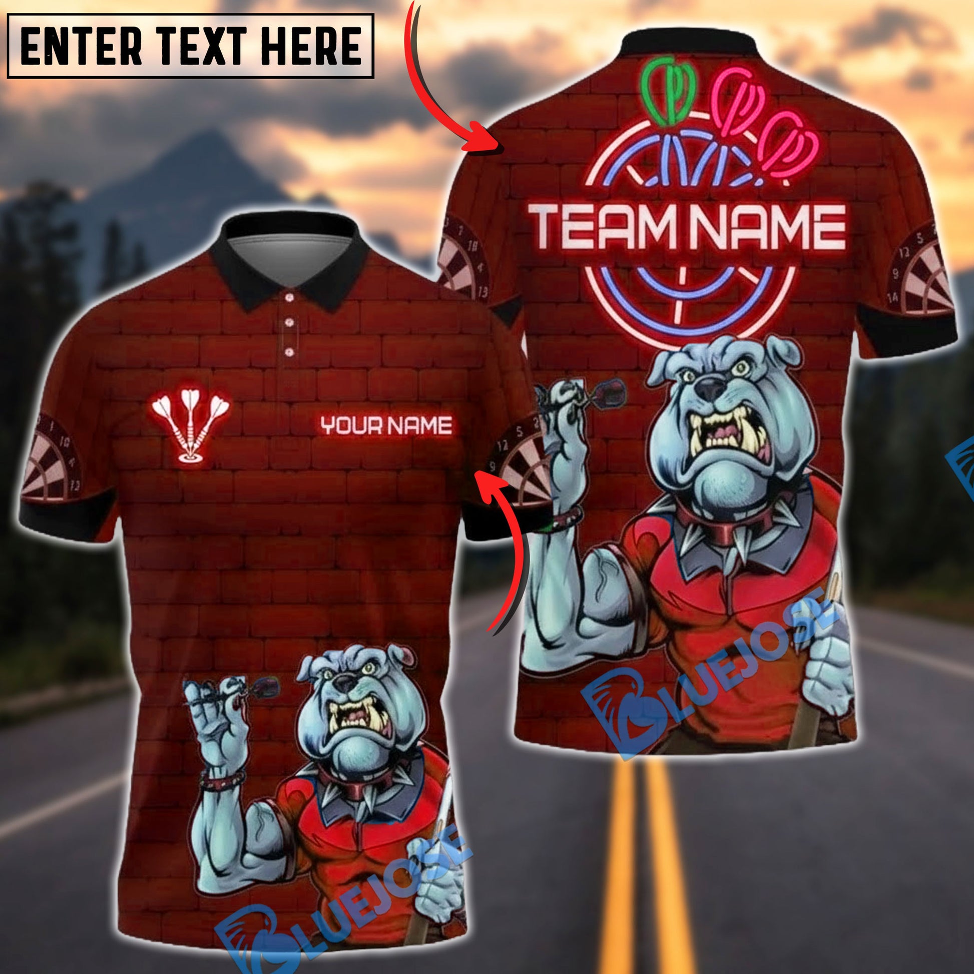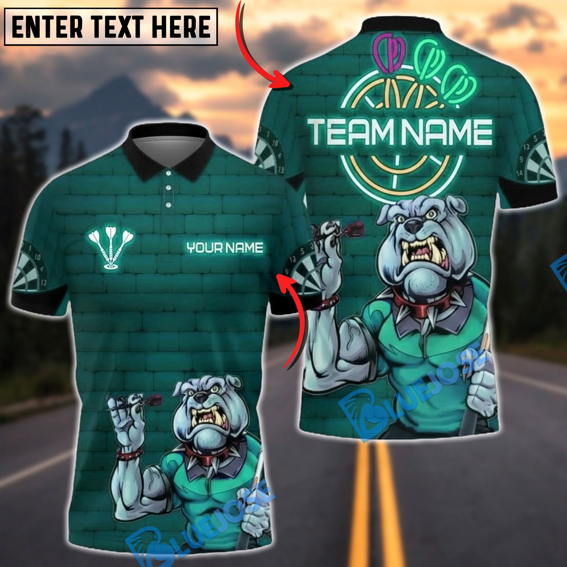 BlueJose Darts Bulldog Neon Personalized Name, Team Name Unisex Shirt (4 Colors)