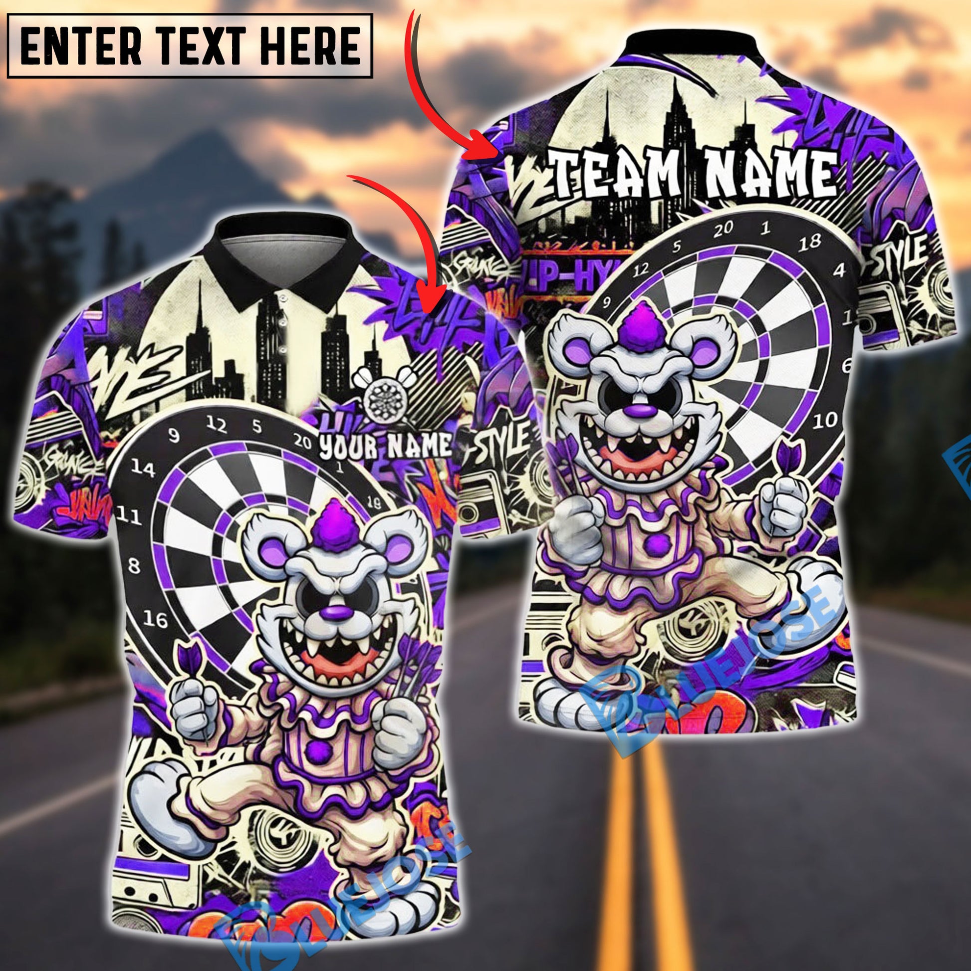 BlueJose Darts Clown Urban Graffiti Art Multicolor Options Personalized Name Shirt (4 Colors)