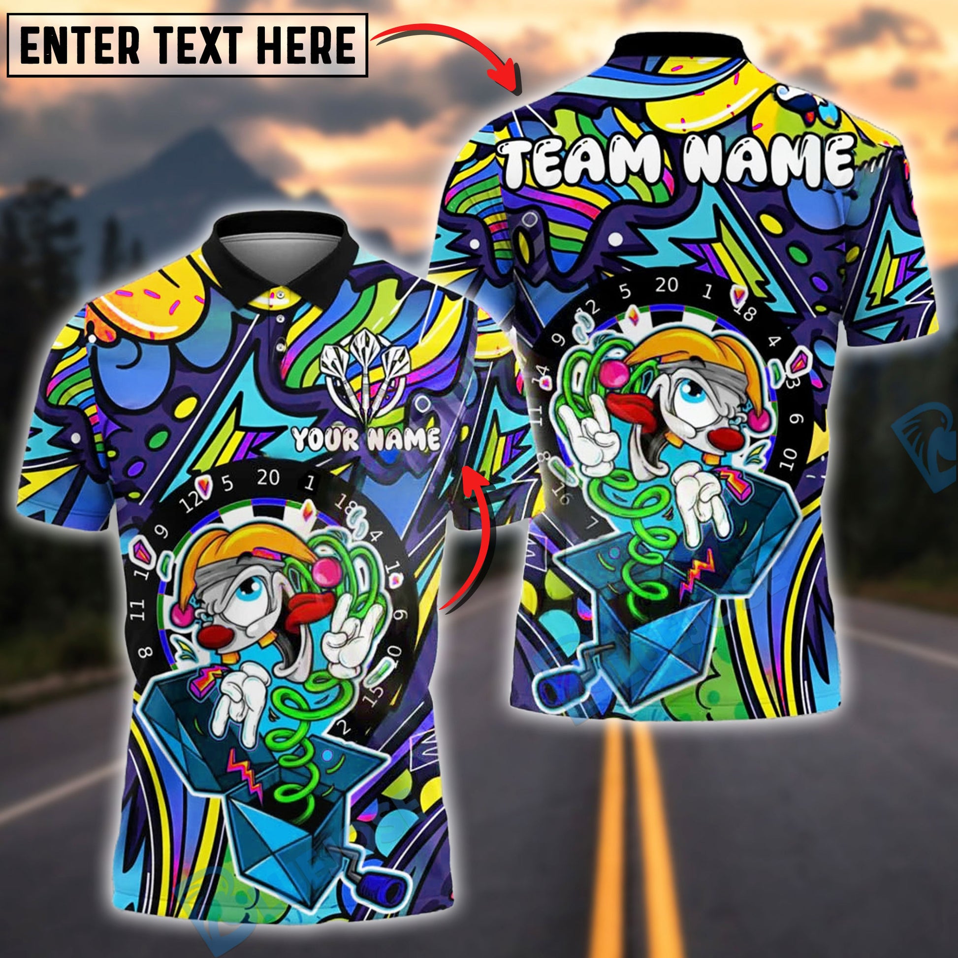 BlueJose Darts Colorblast Cartoon Character Customized Name, Team Name 3D Shirt (4 Colors)