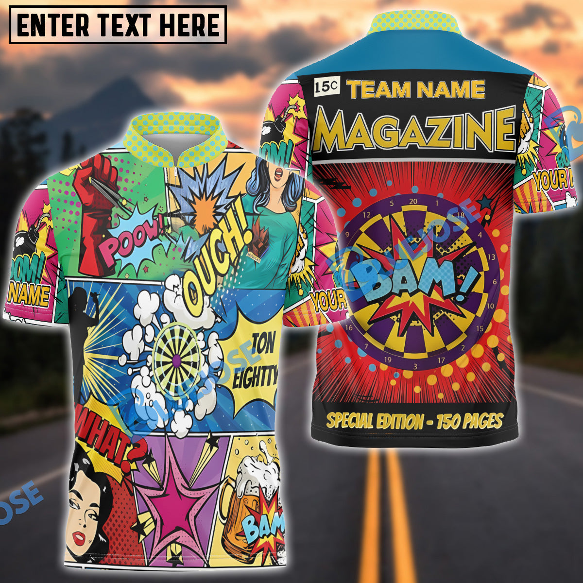 BlueJose Darts Comic Blast Personalized Name, Team Name Shirt (4 Colors)