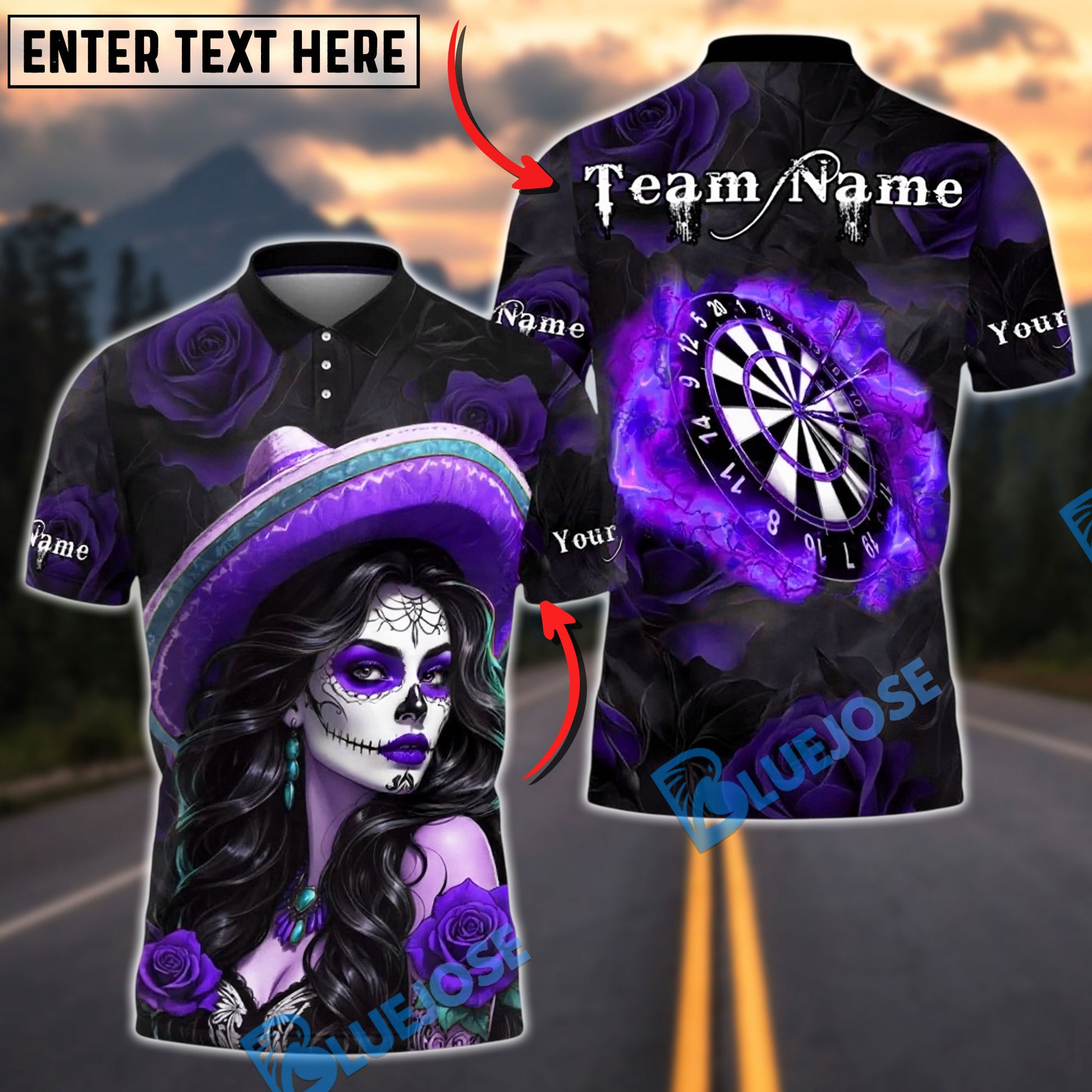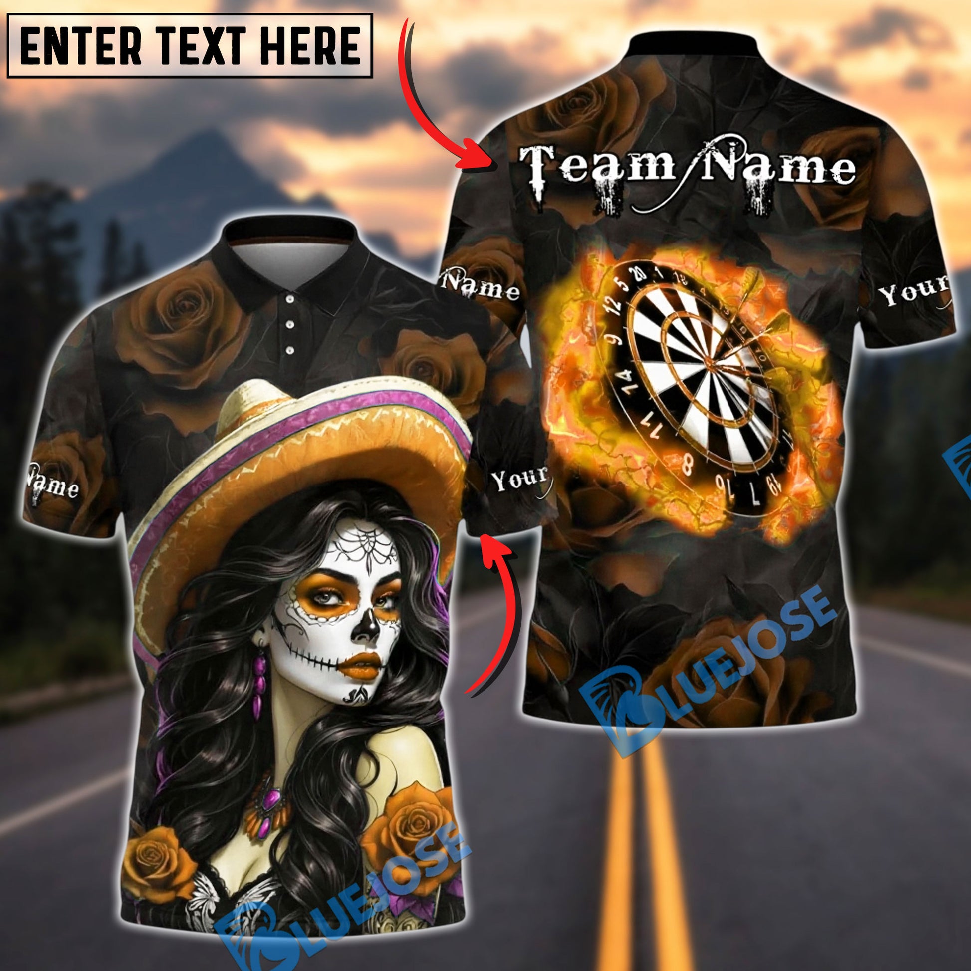 BlueJose Darts Dartboard Day of the Dead Girl Roses Skull Art Personalized Name, Team Name Unisex Shirt (6 Colors)