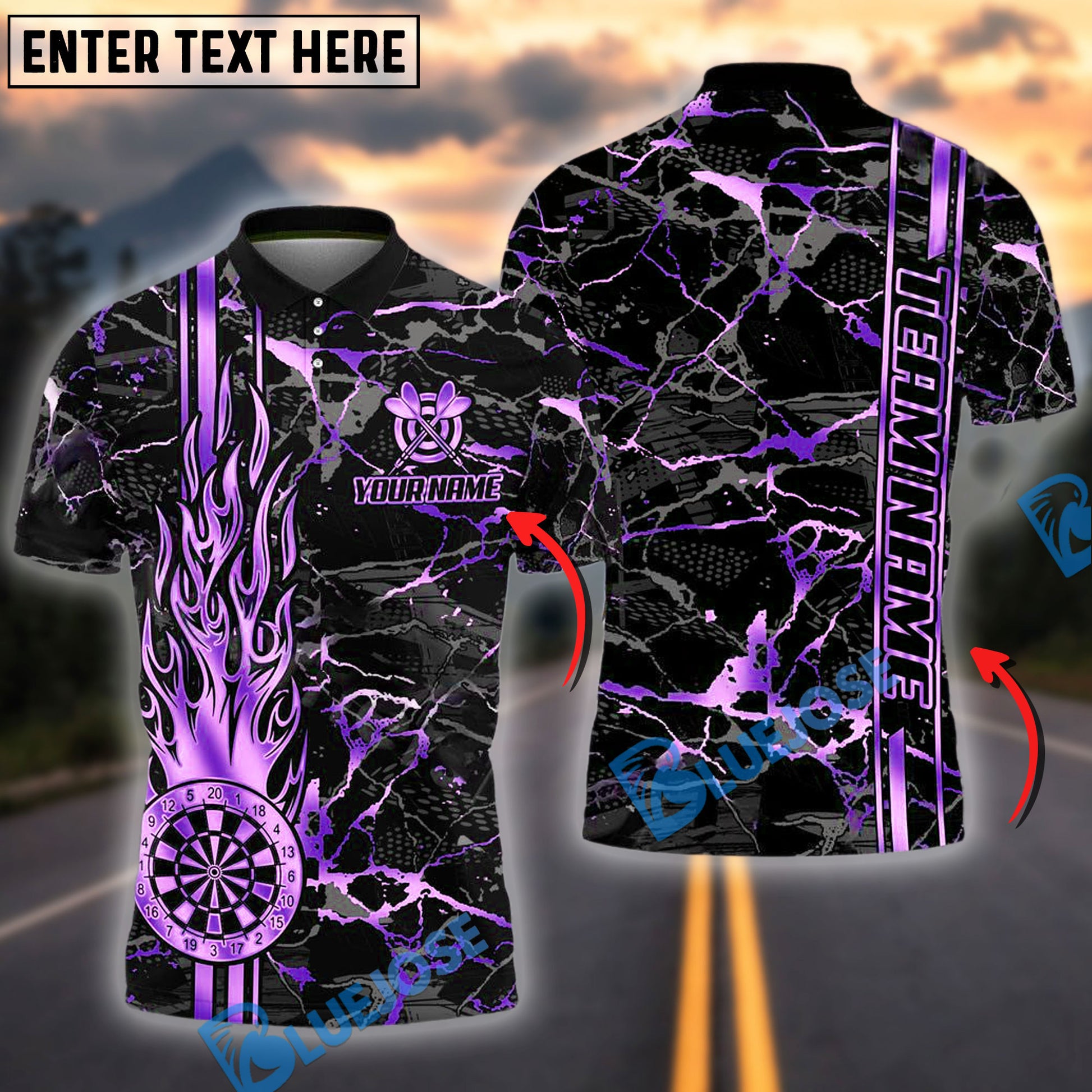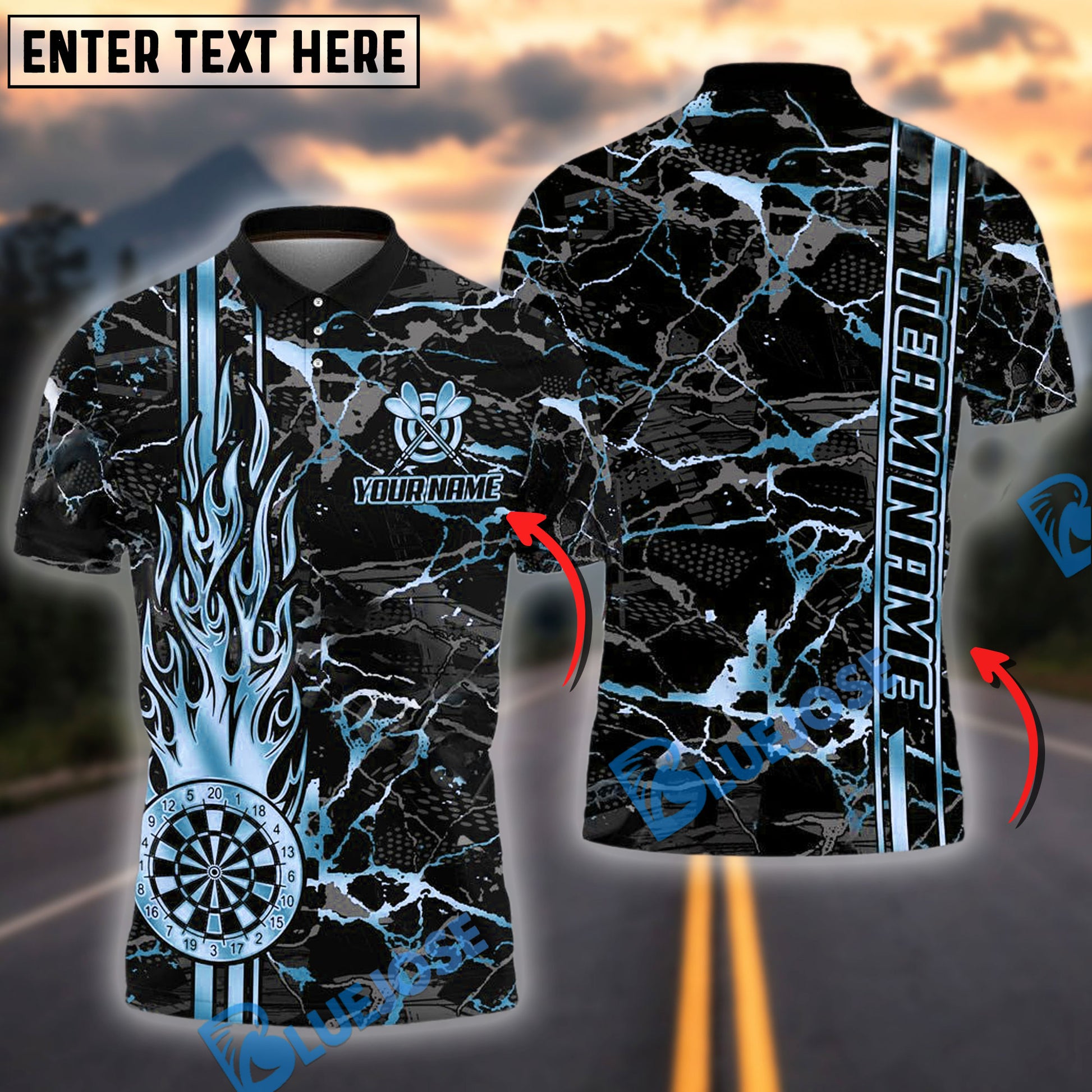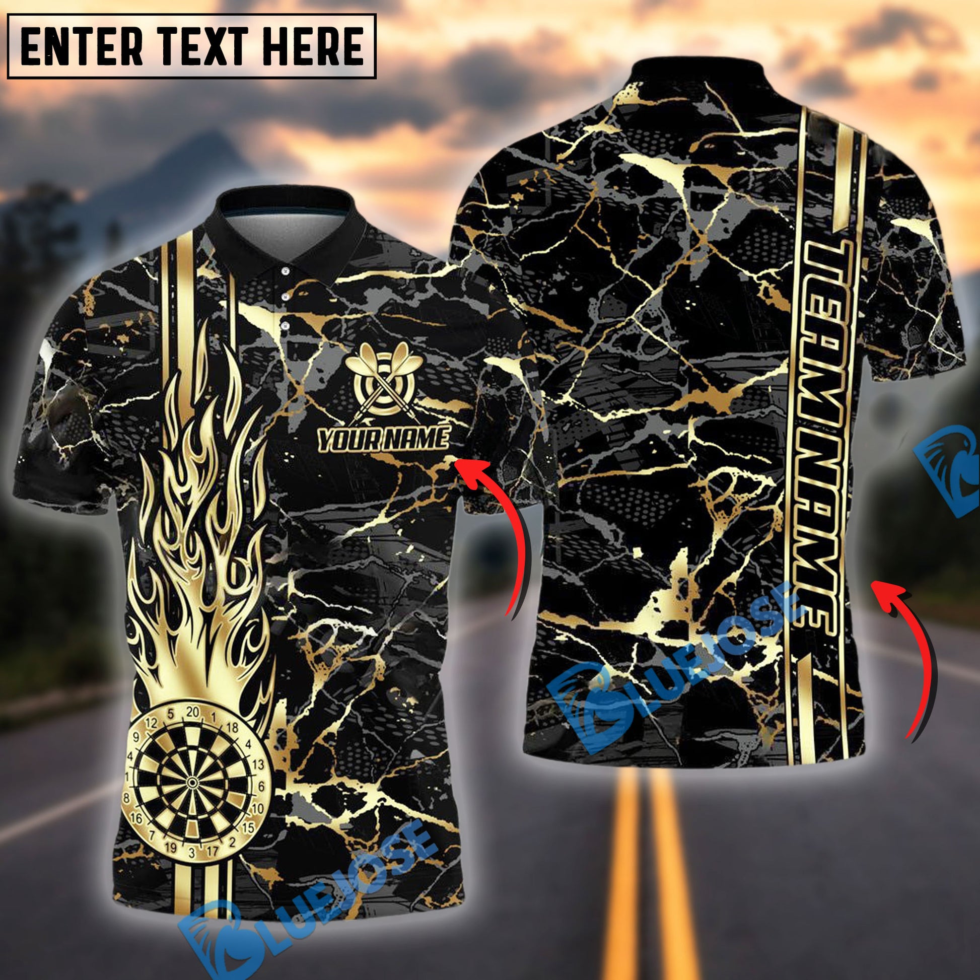 BlueJose Darts Flame Golden Personalized Name, Team Name Shirt (4 Colors)
