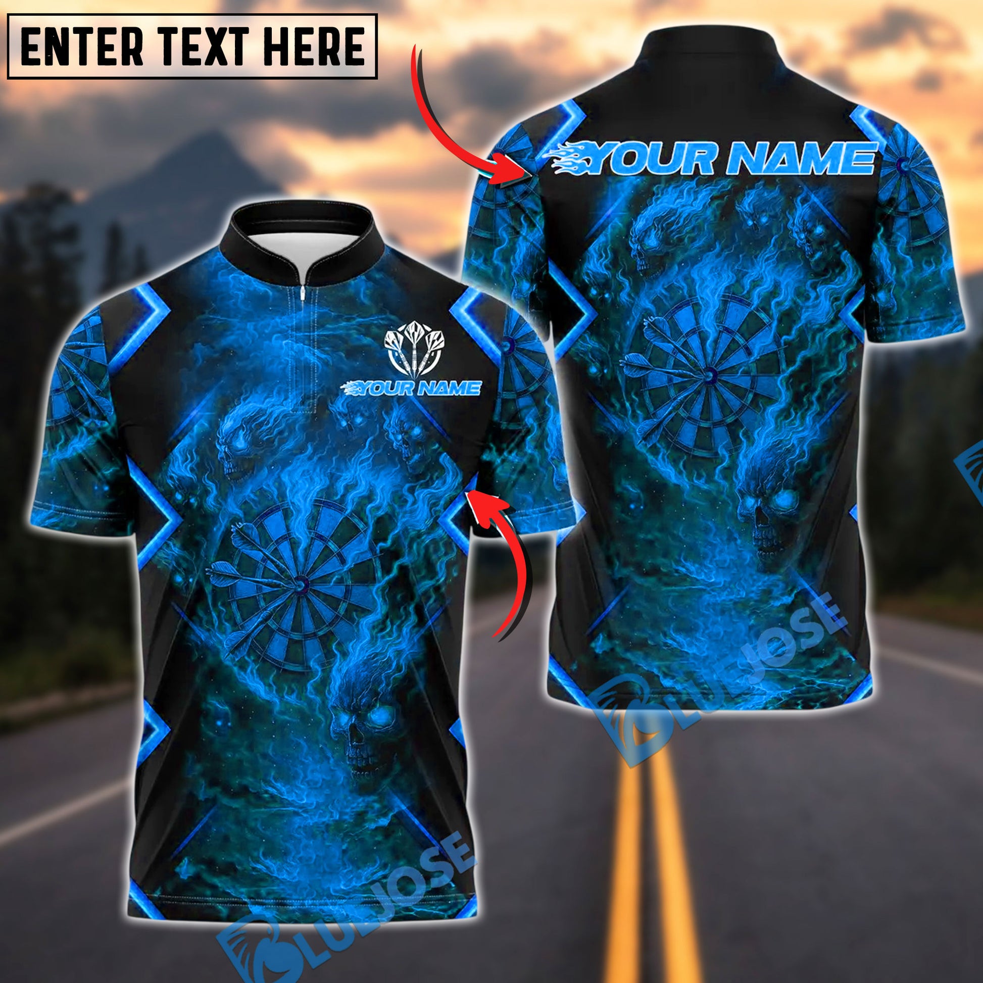 BlueJose Darts Flame Skull With Dartboard Design 2 Customized Name, Team Name 3D Shirt (4 Colors)