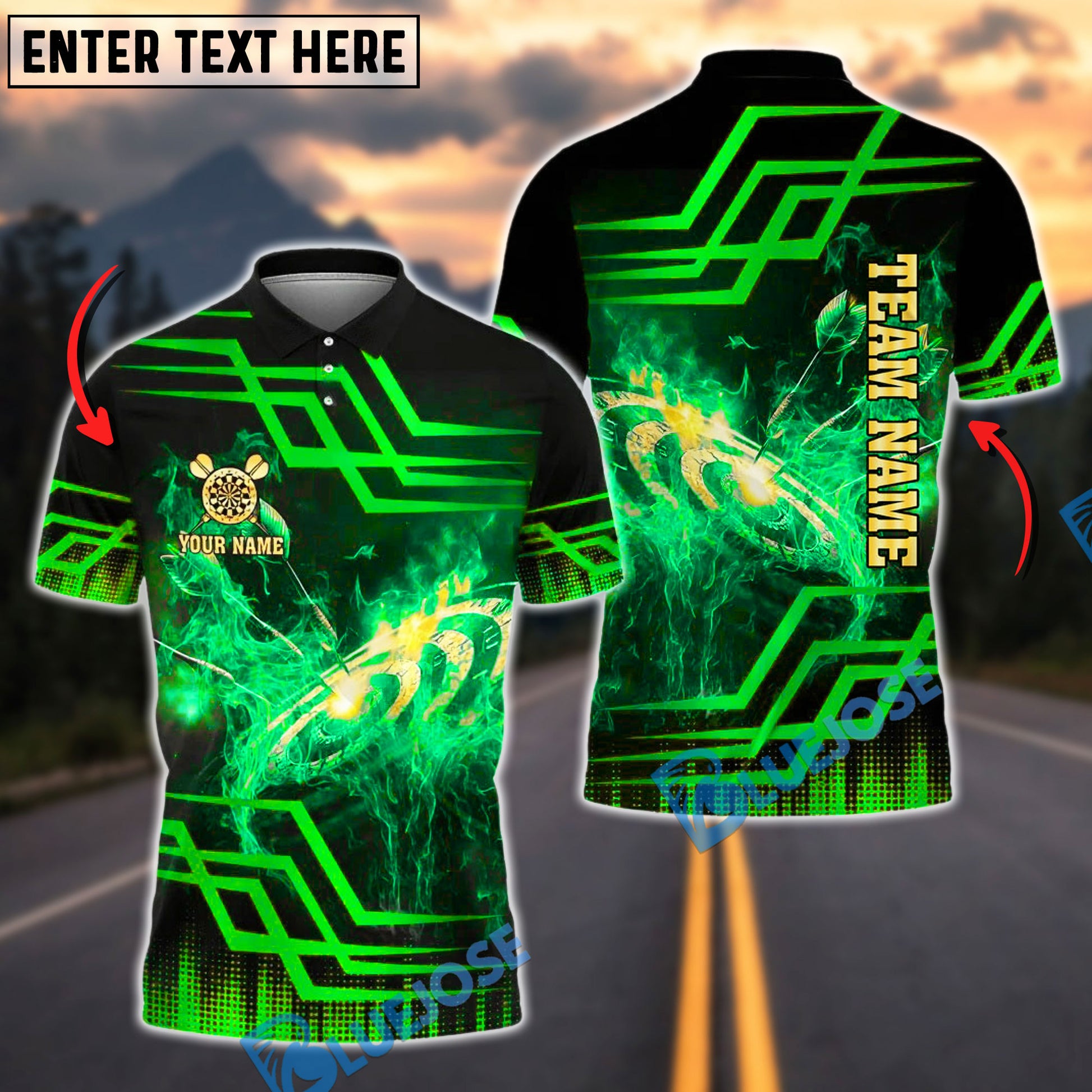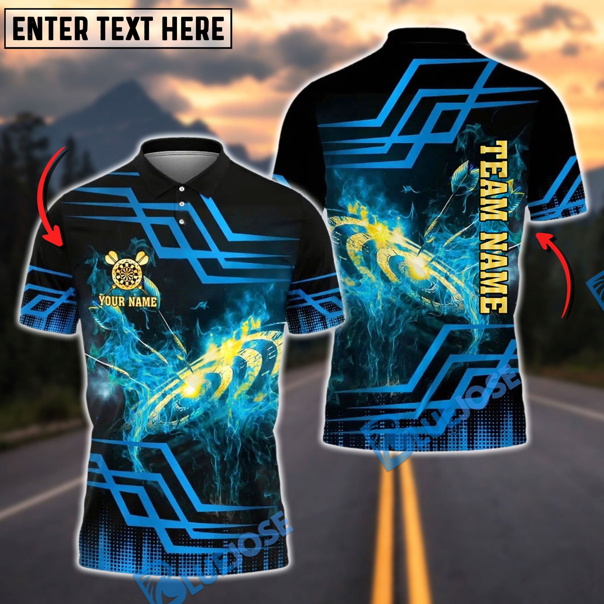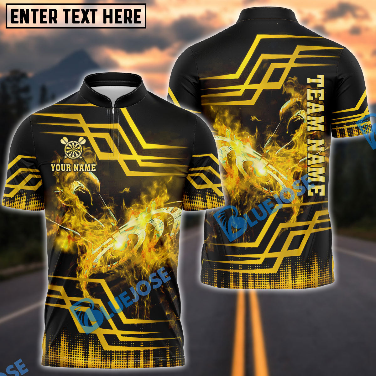 BlueJose Darts Flaming Dartboard Gold Geometric Customized Name, Team Name 3D Shirt (4 Colors)