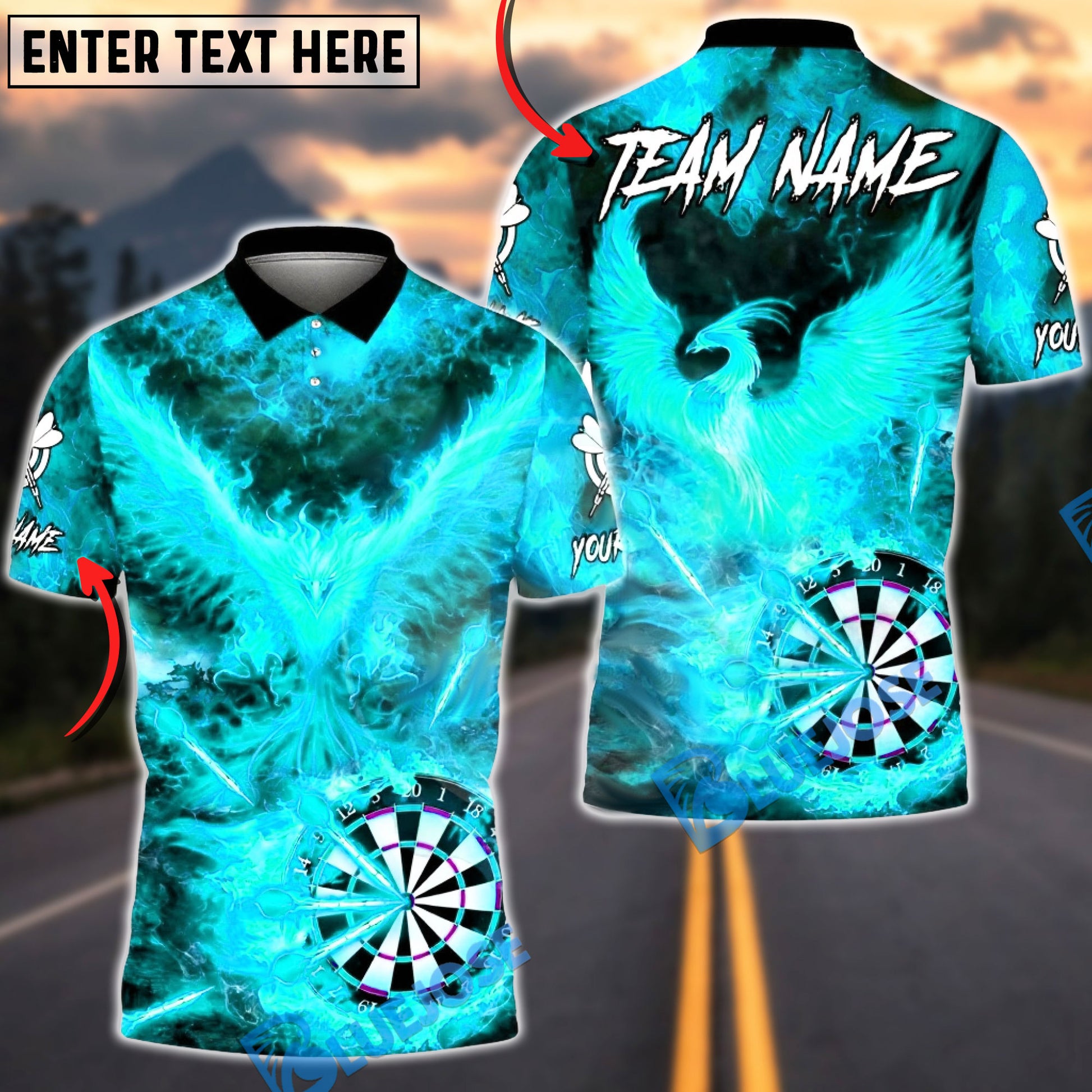 BlueJose Darts Flaming Phoenix Dartboard Multicolor Options Personalized Name Shirt (4 Colors)