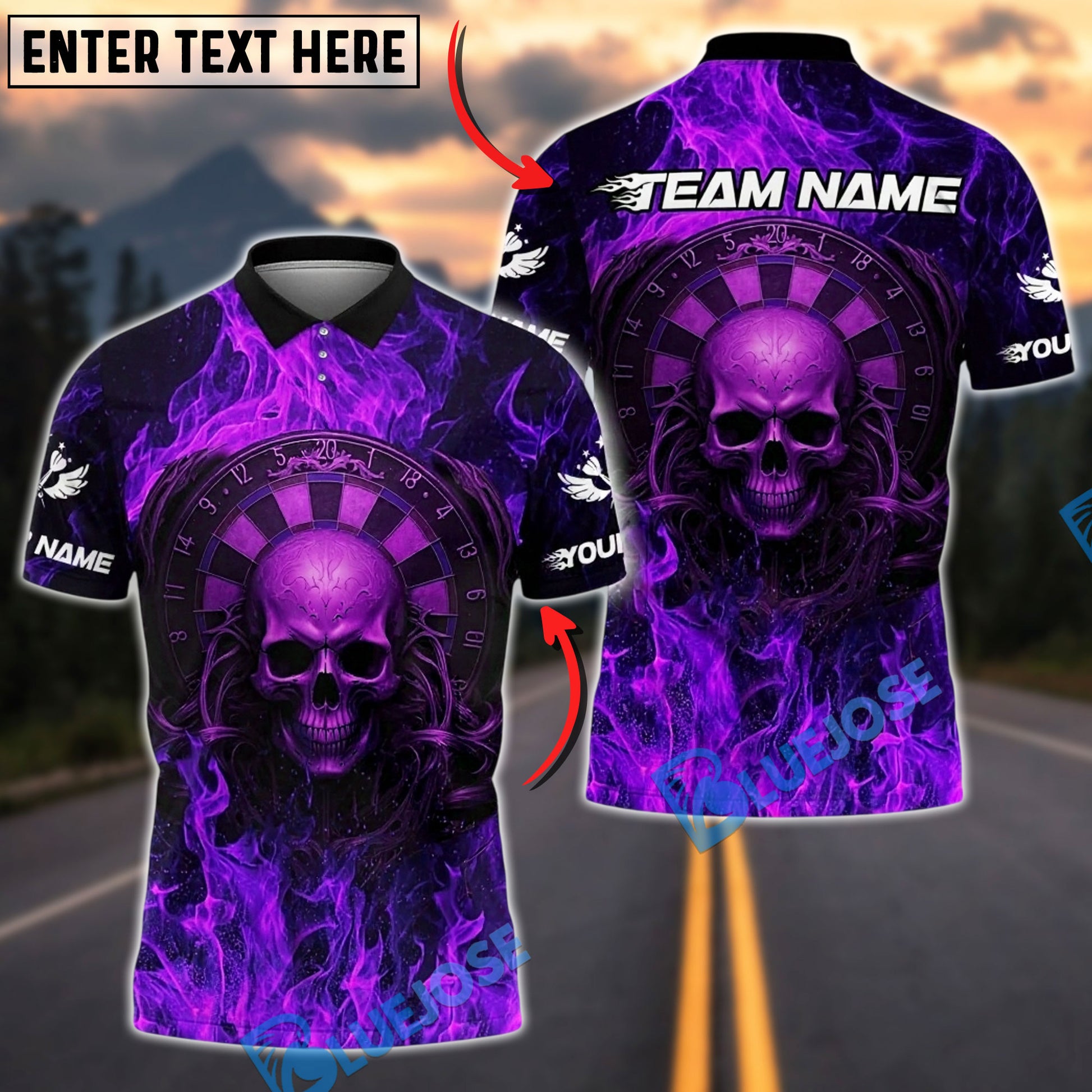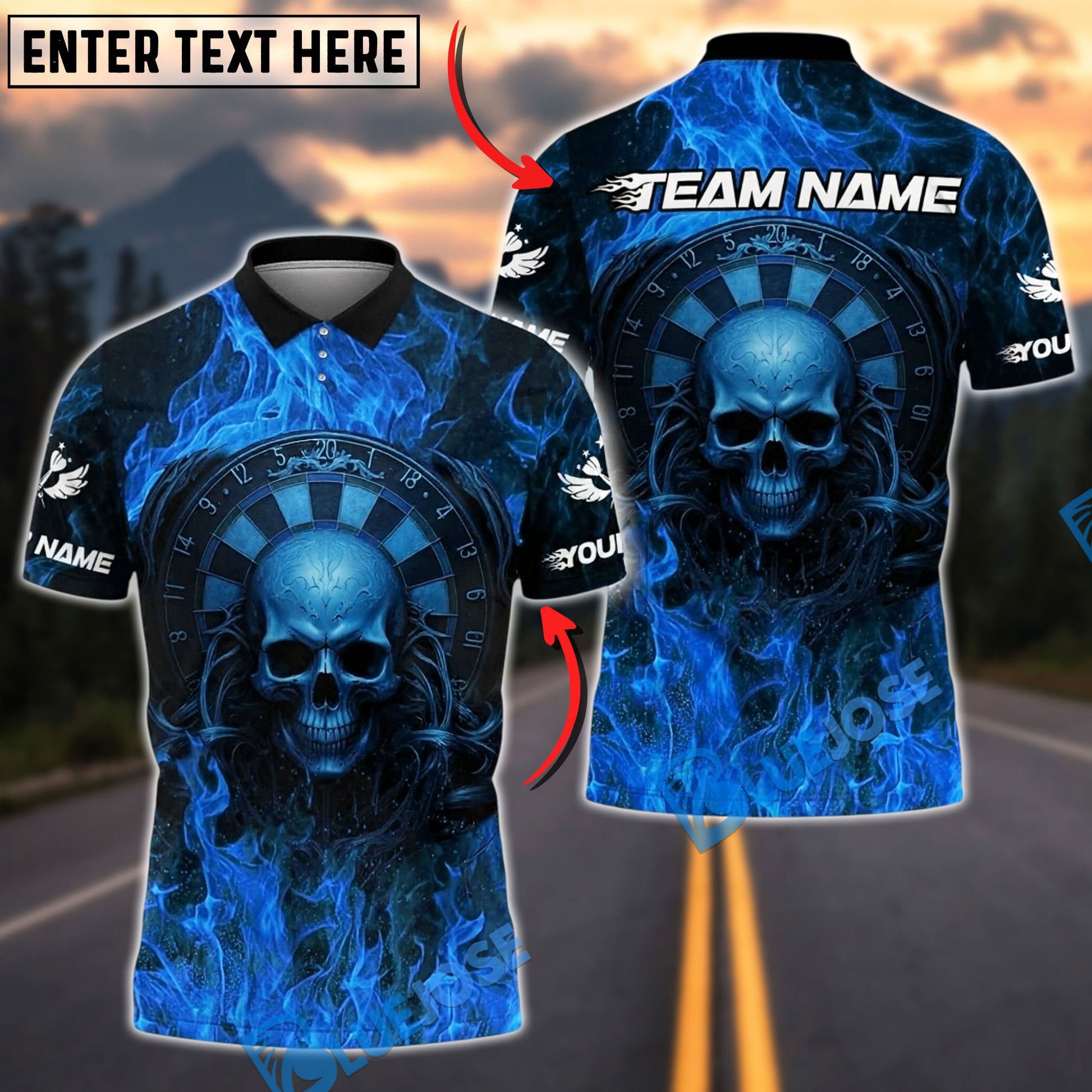 BlueJose Darts Flaming Skull Dartboard Personalized Name, Team Name Unisex Shirt (4 Colors)