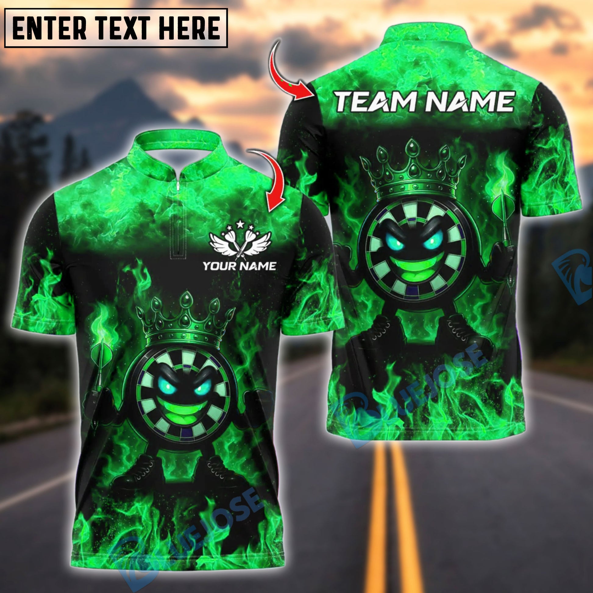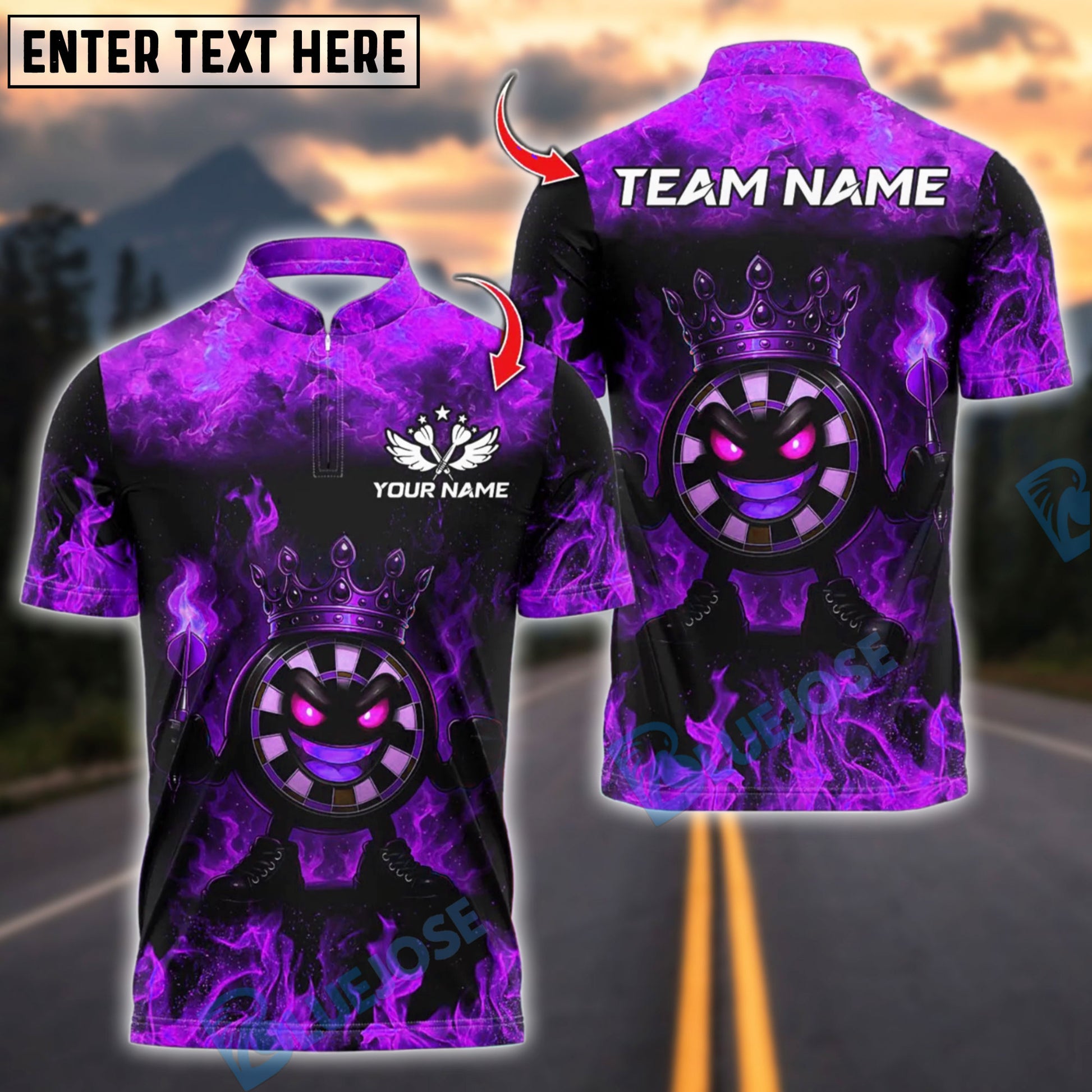 BlueJose Darts Funny Dartboard King Flame Crown Design Customized Name, Team Name 3D Shirt (4 Colors)