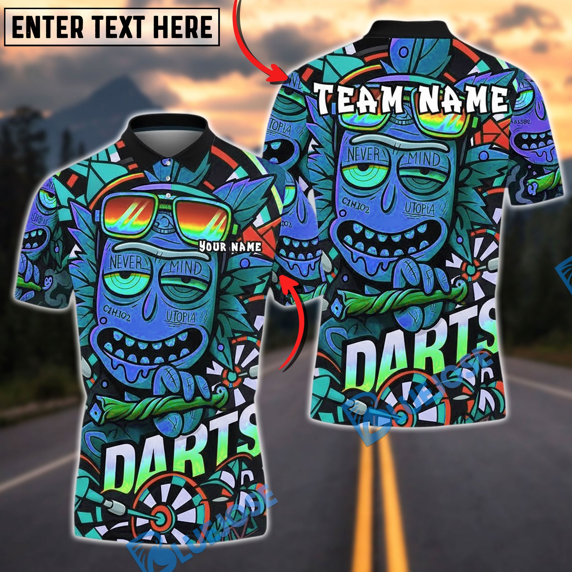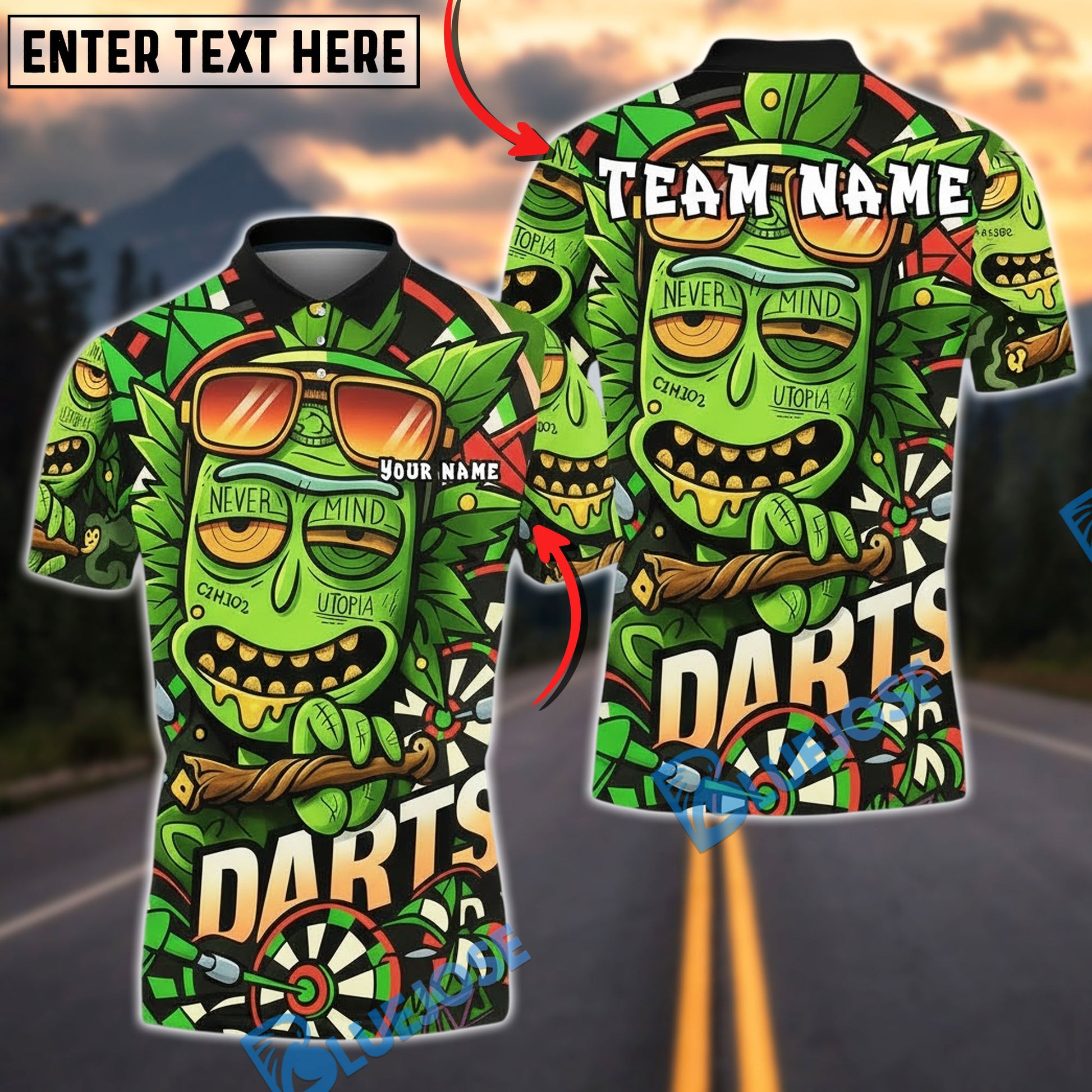 BlueJose Darts Funny Green Leaf Dartboard Cartoon Personalized Name, Team Name Unisex Shirt (4 Colors)