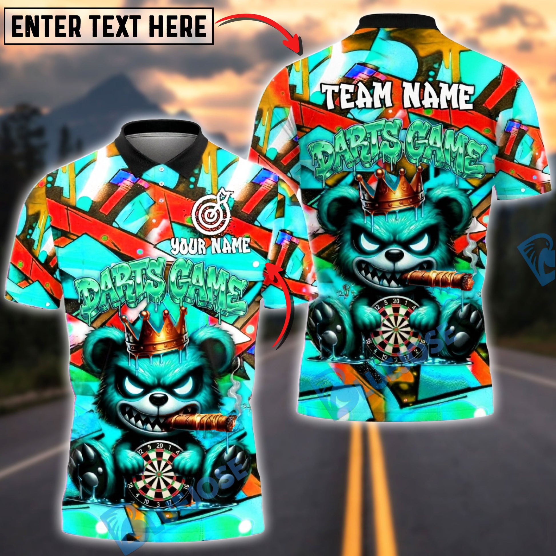 BlueJose Darts Graffiti Angry Bear with Dartboard Street Art Design Multicolor Options Personalized Name Shirt (4 Colors)