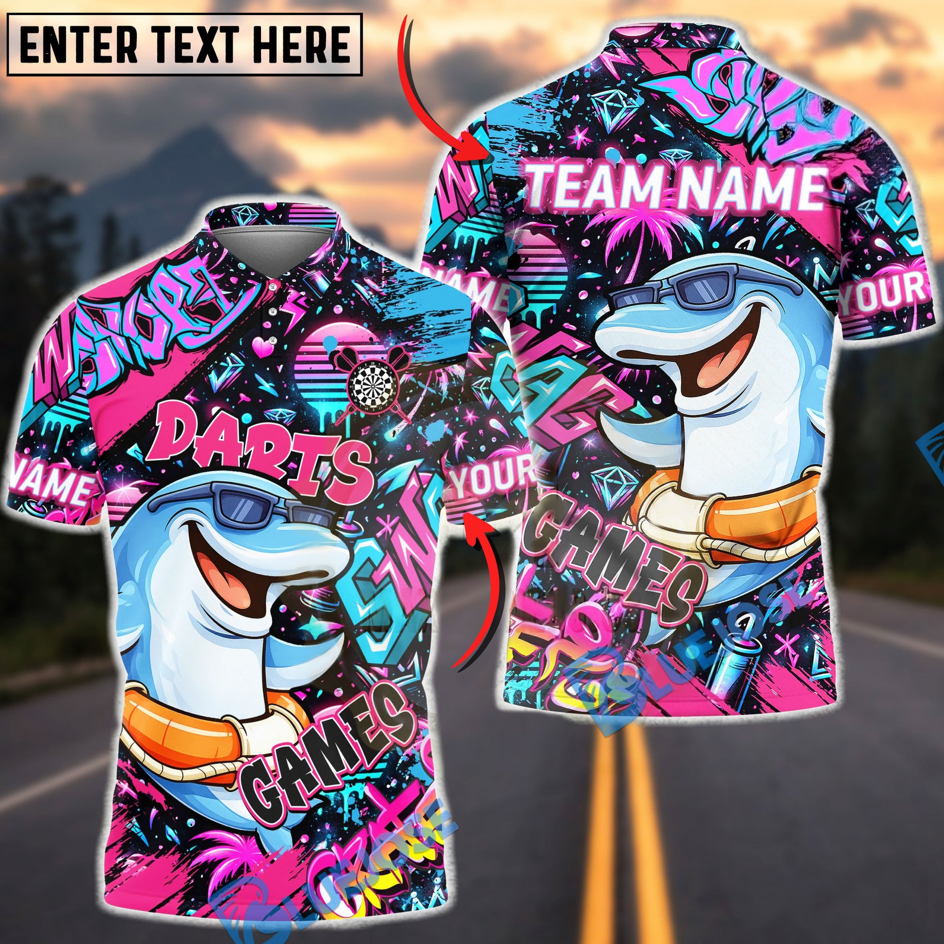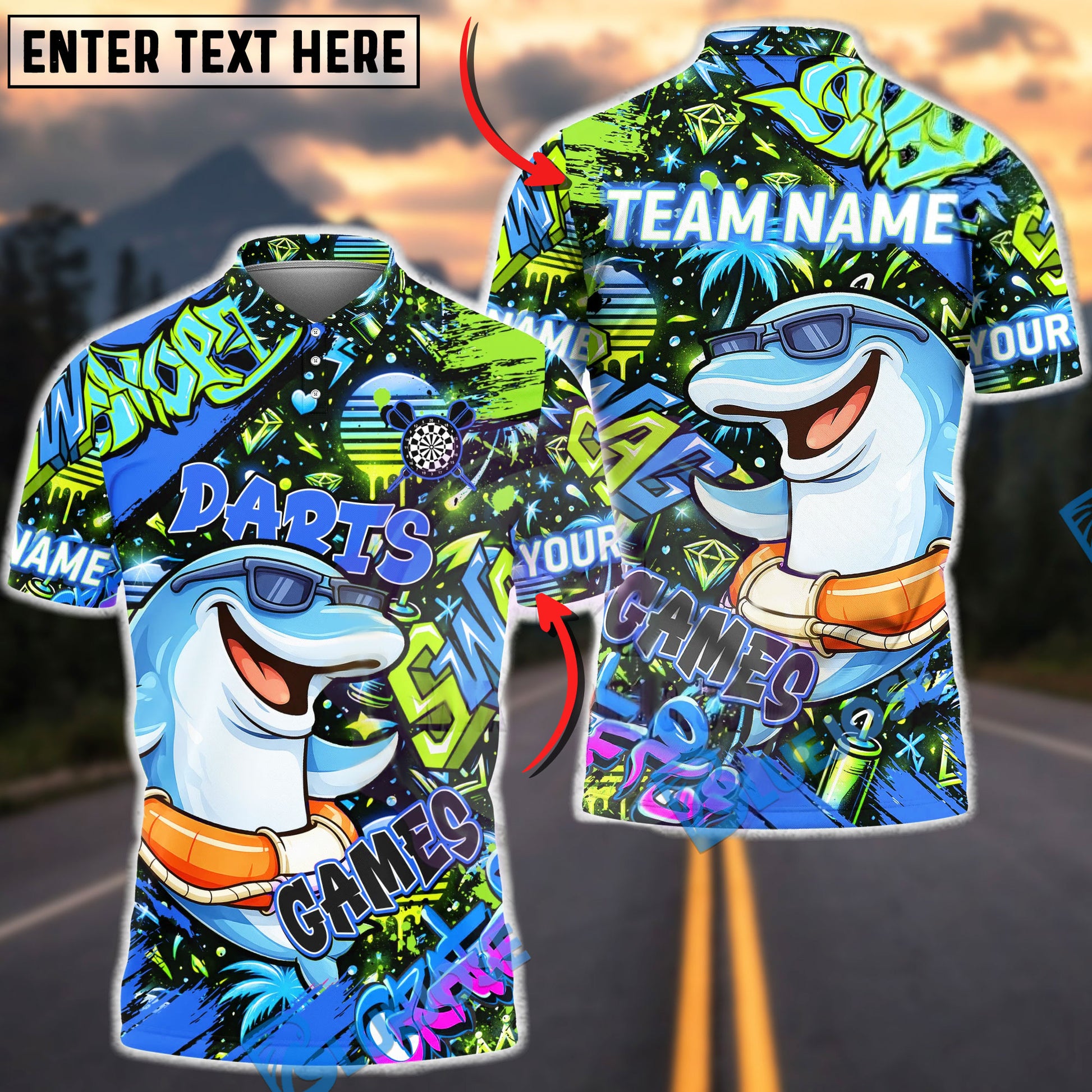 BlueJose Darts Graffiti Cool Dolphin Game Character Multicolor Options Personalized Name Shirt (4 Colors)
