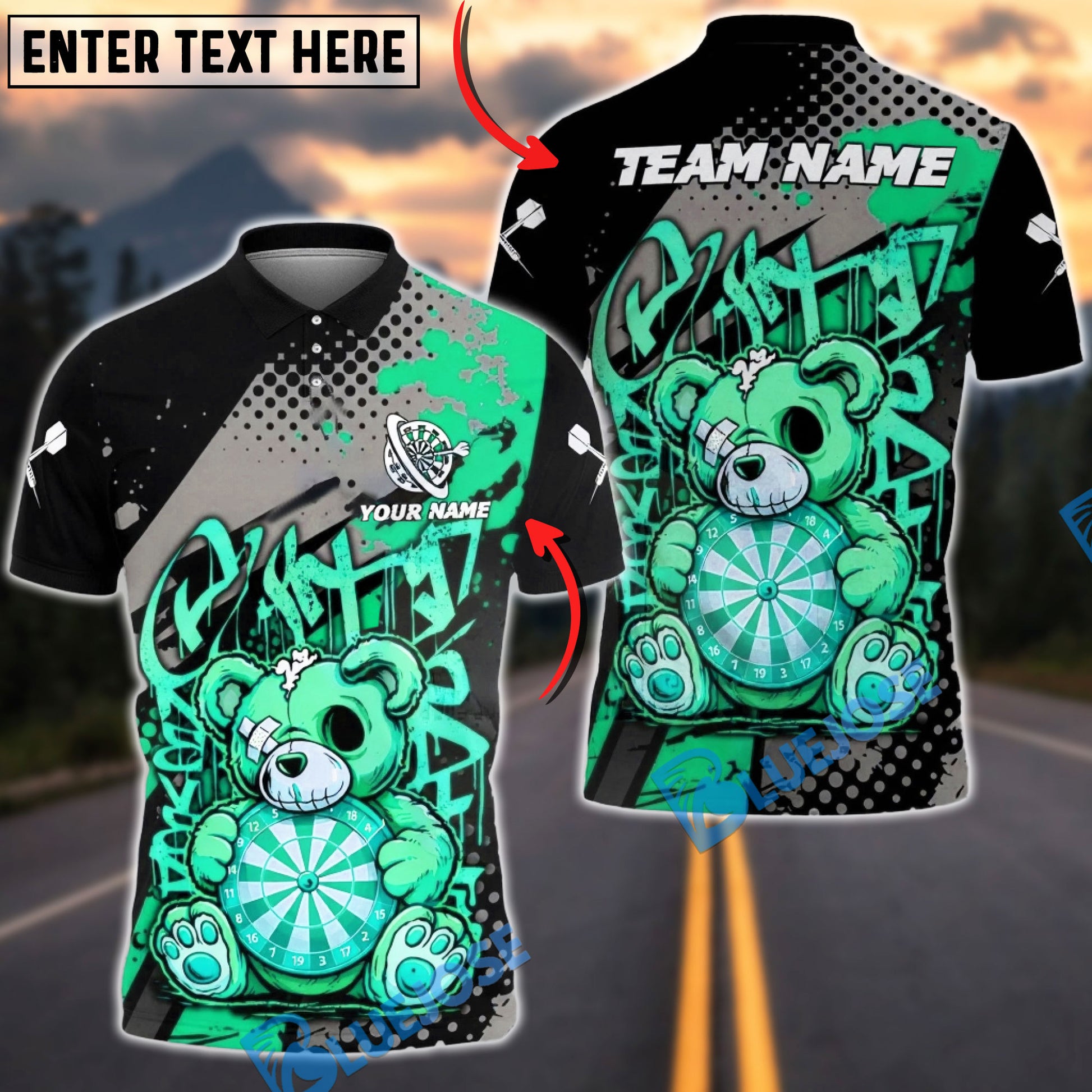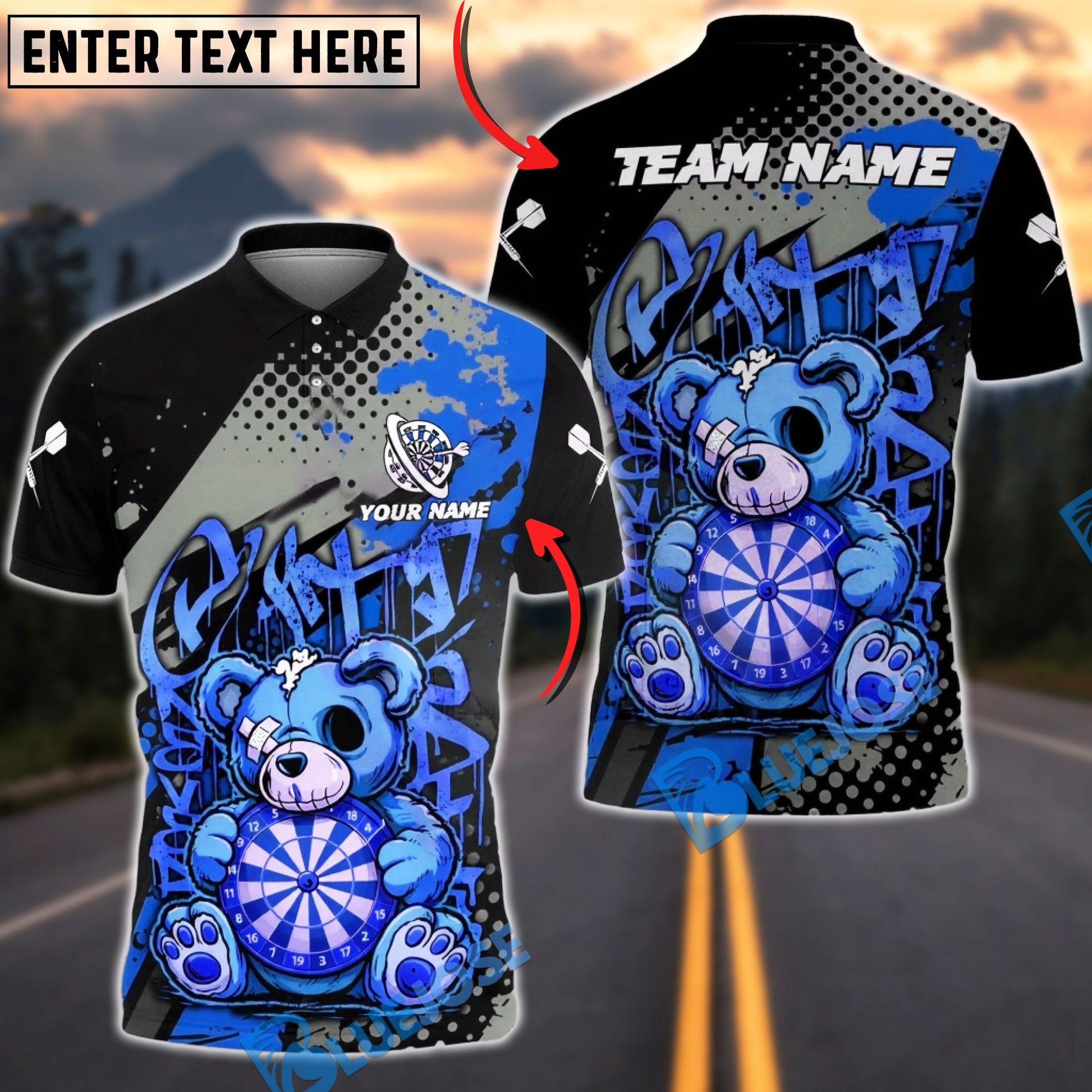 BlueJose Darts Graffiti Teddy Bear Dartboard Art Multicolor Options Personalized Name Shirt (4 Colors)