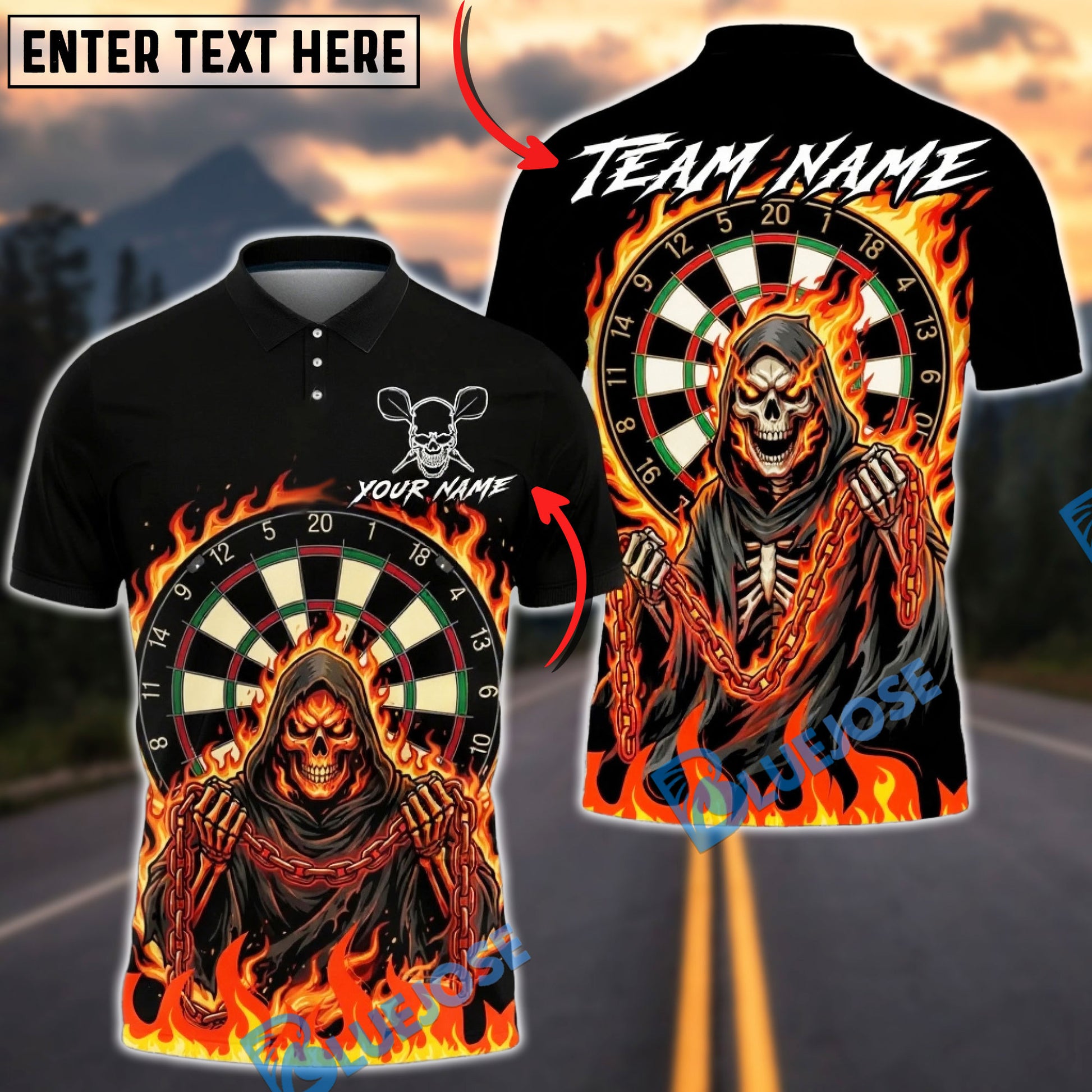 BlueJose Darts Grim Reaper Dartboard Flaming Chains Multicolor Options Personalized Name Shirt (4 Colors)