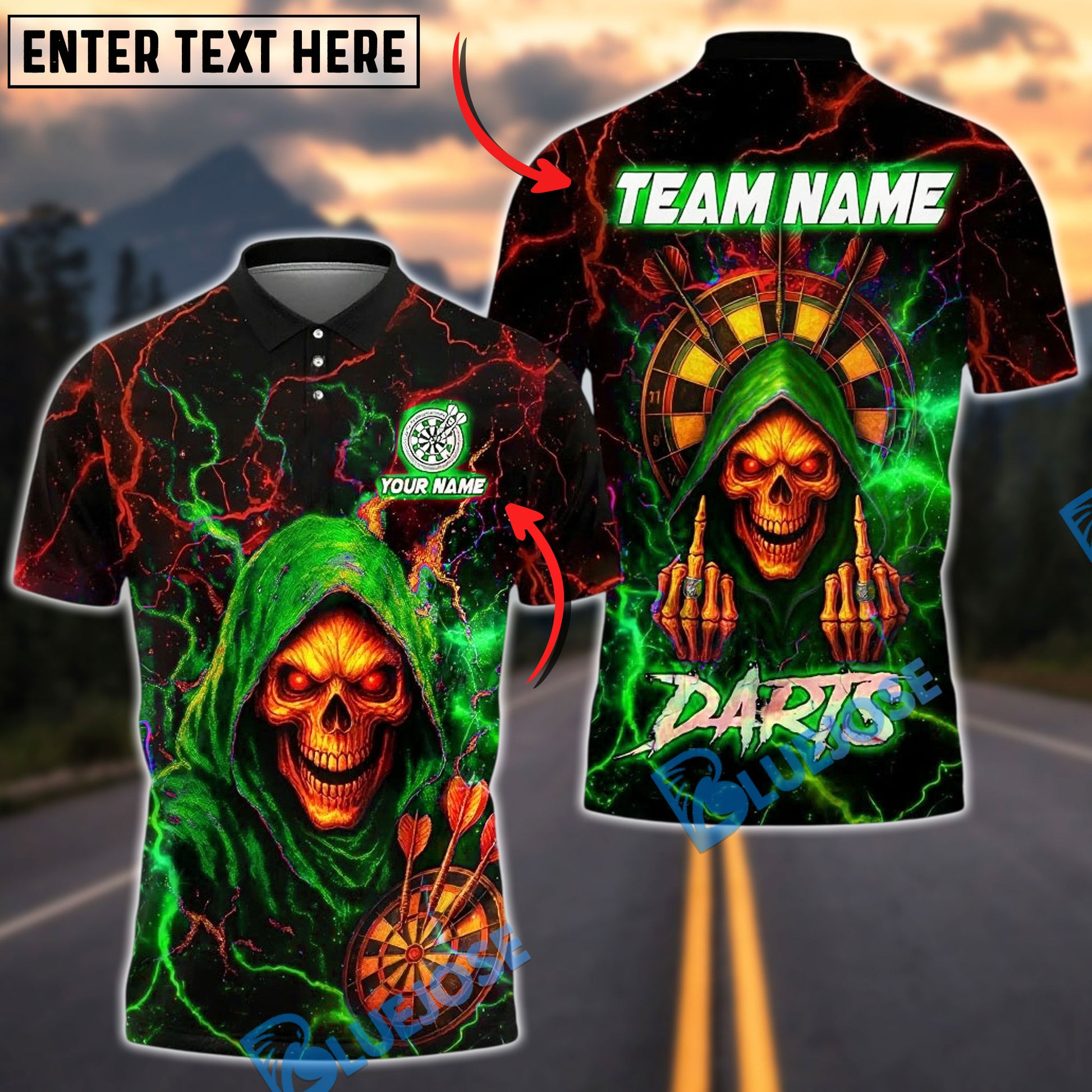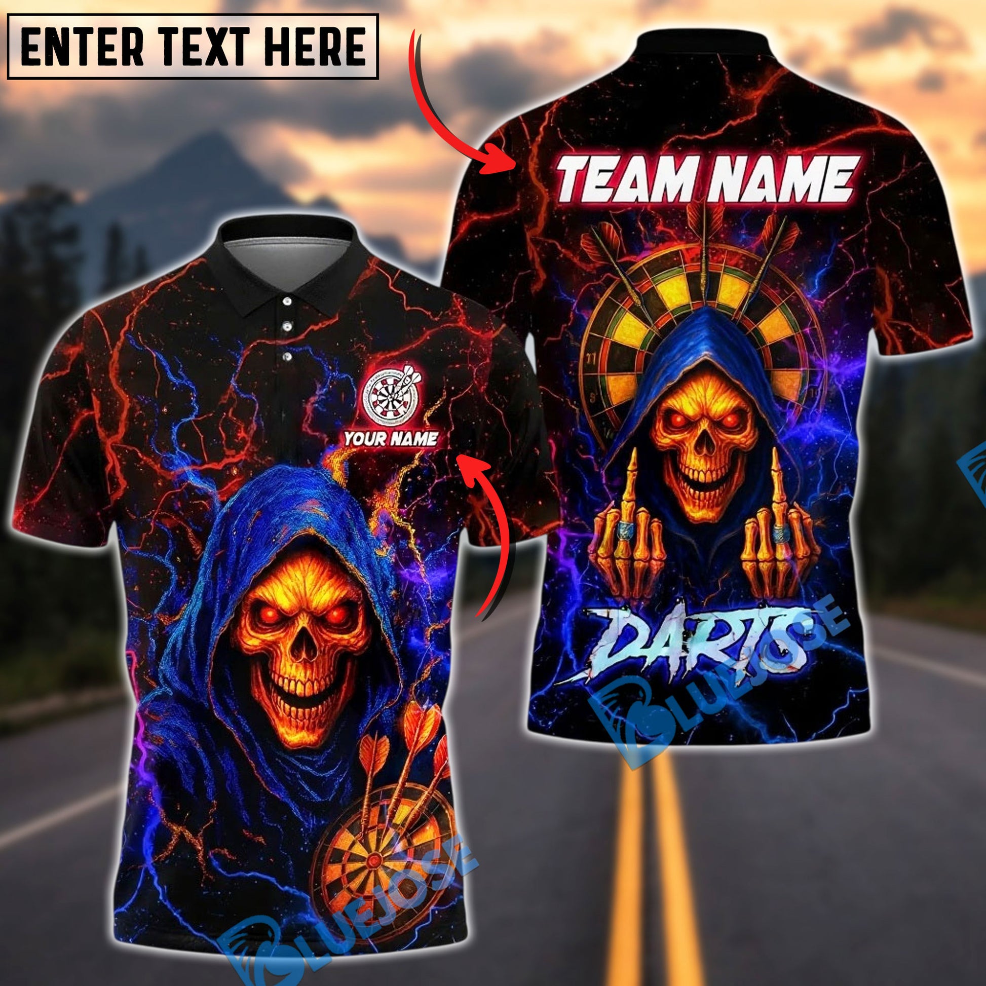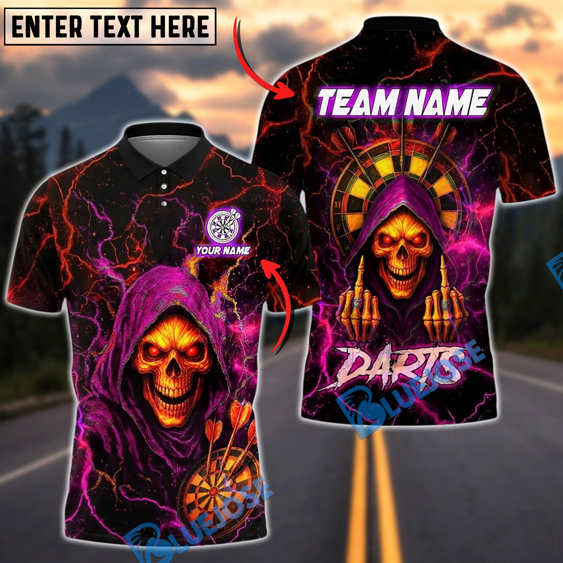 BlueJose Darts Grim Reaper Neon Lightning Customized Name, Team Name 3D Shirt (4 Colors)