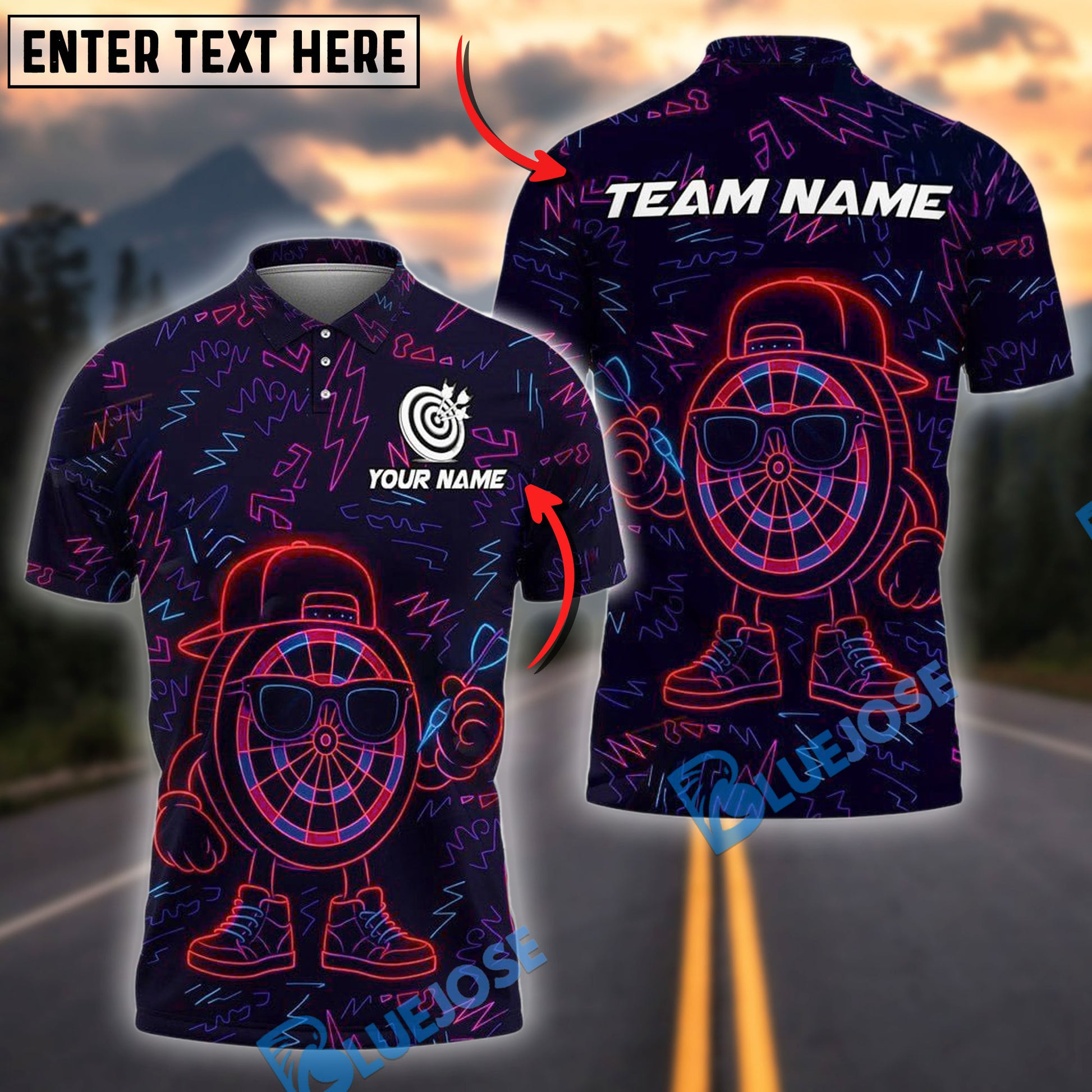 BlueJose Darts Neon Funny Personalized Name, Team Name Shirt (4 Colors)