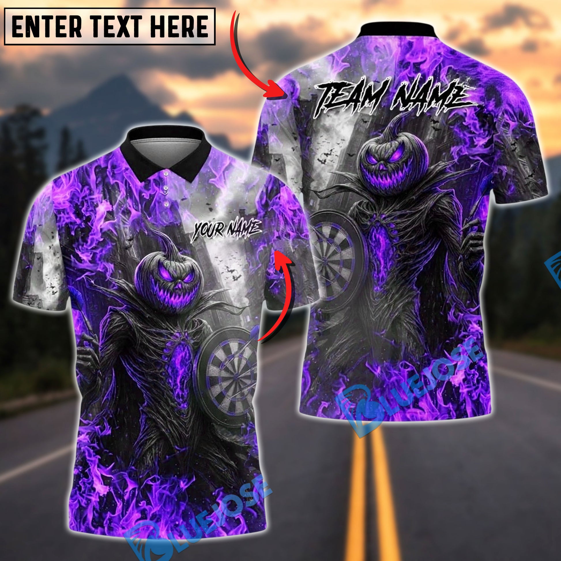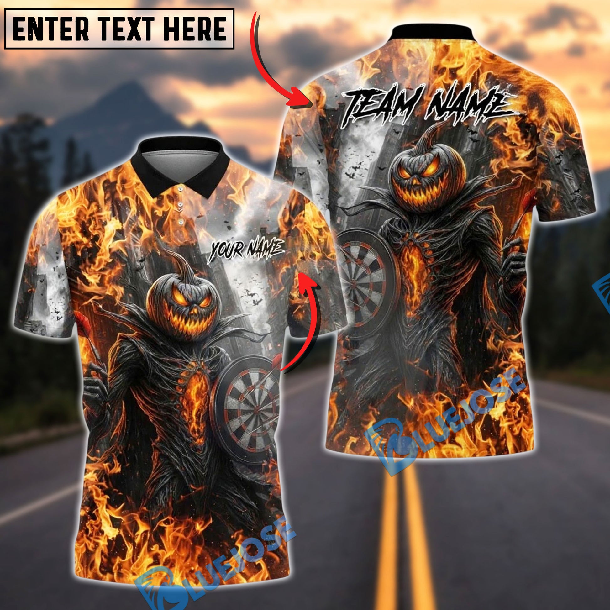 BlueJose Darts Pumpkin Fire Halloween Personalized Name, Team Name Unisex Shirt (4 Colors)
