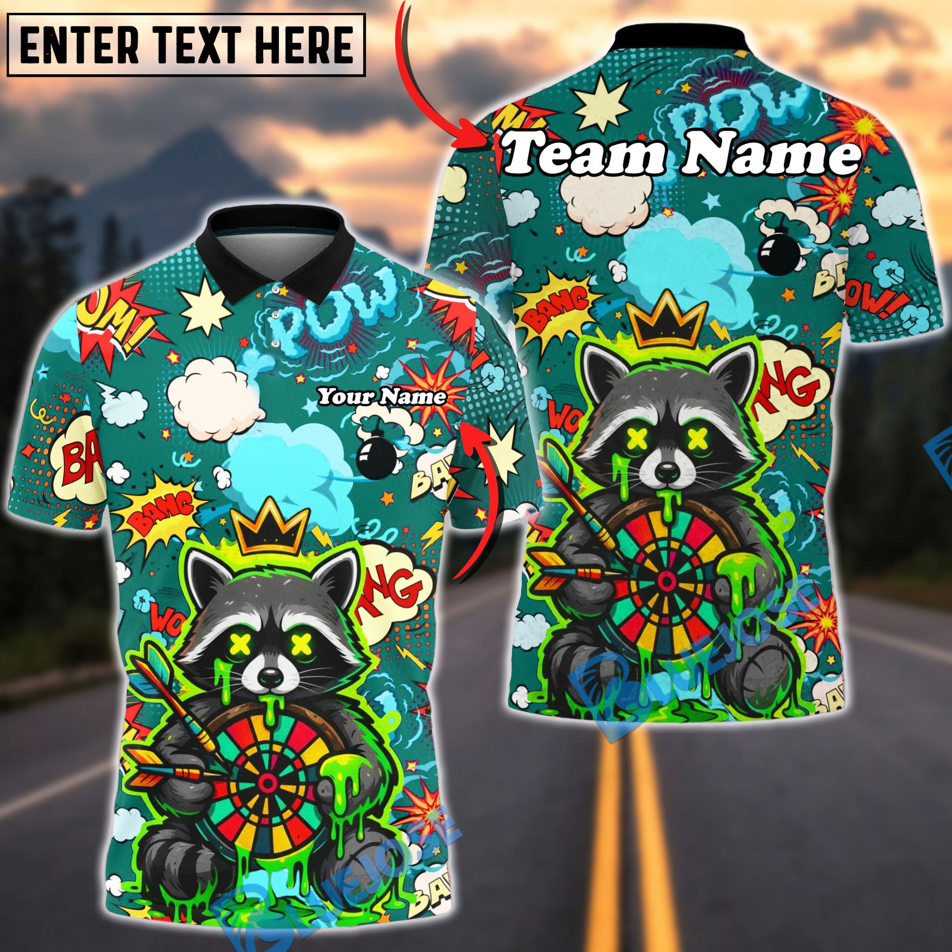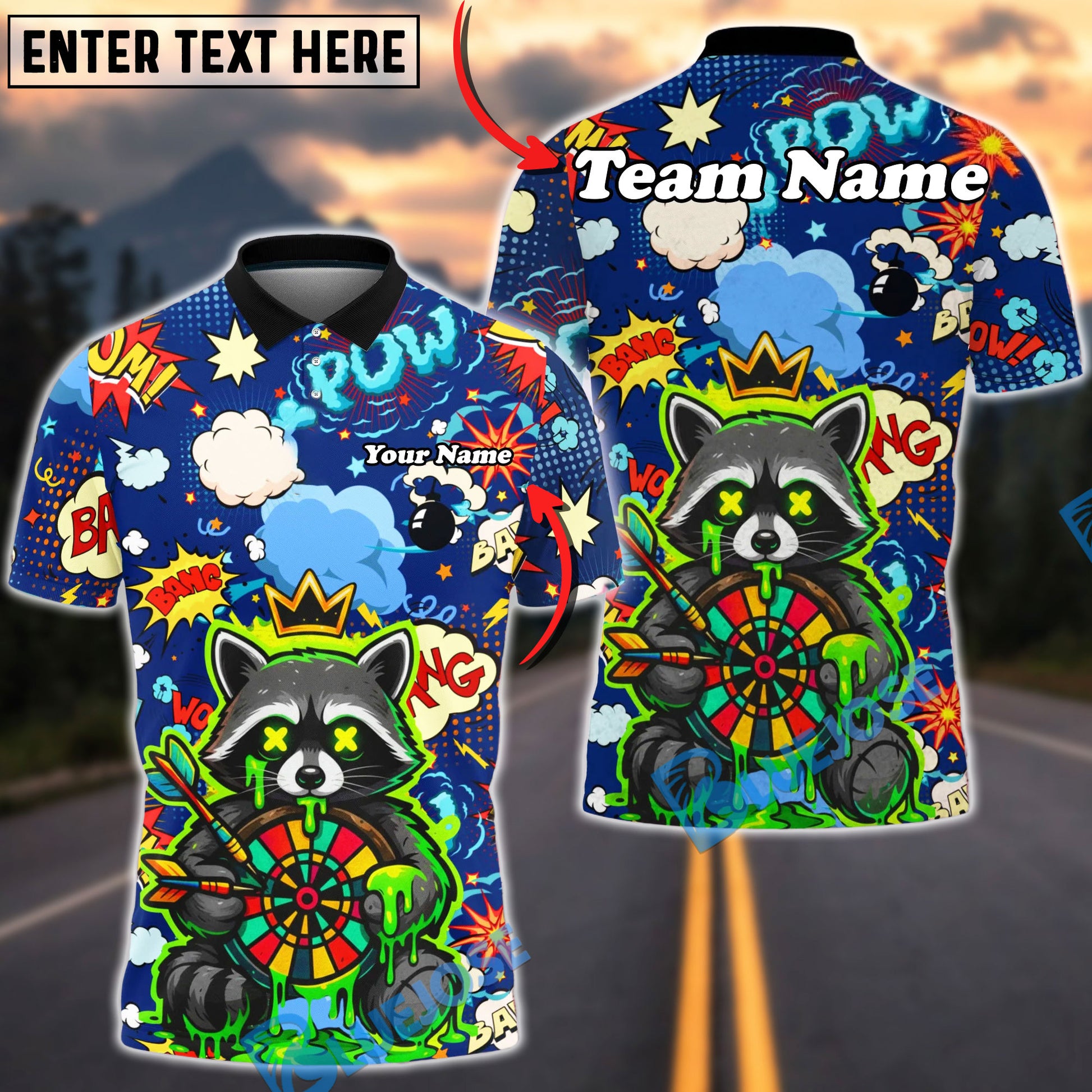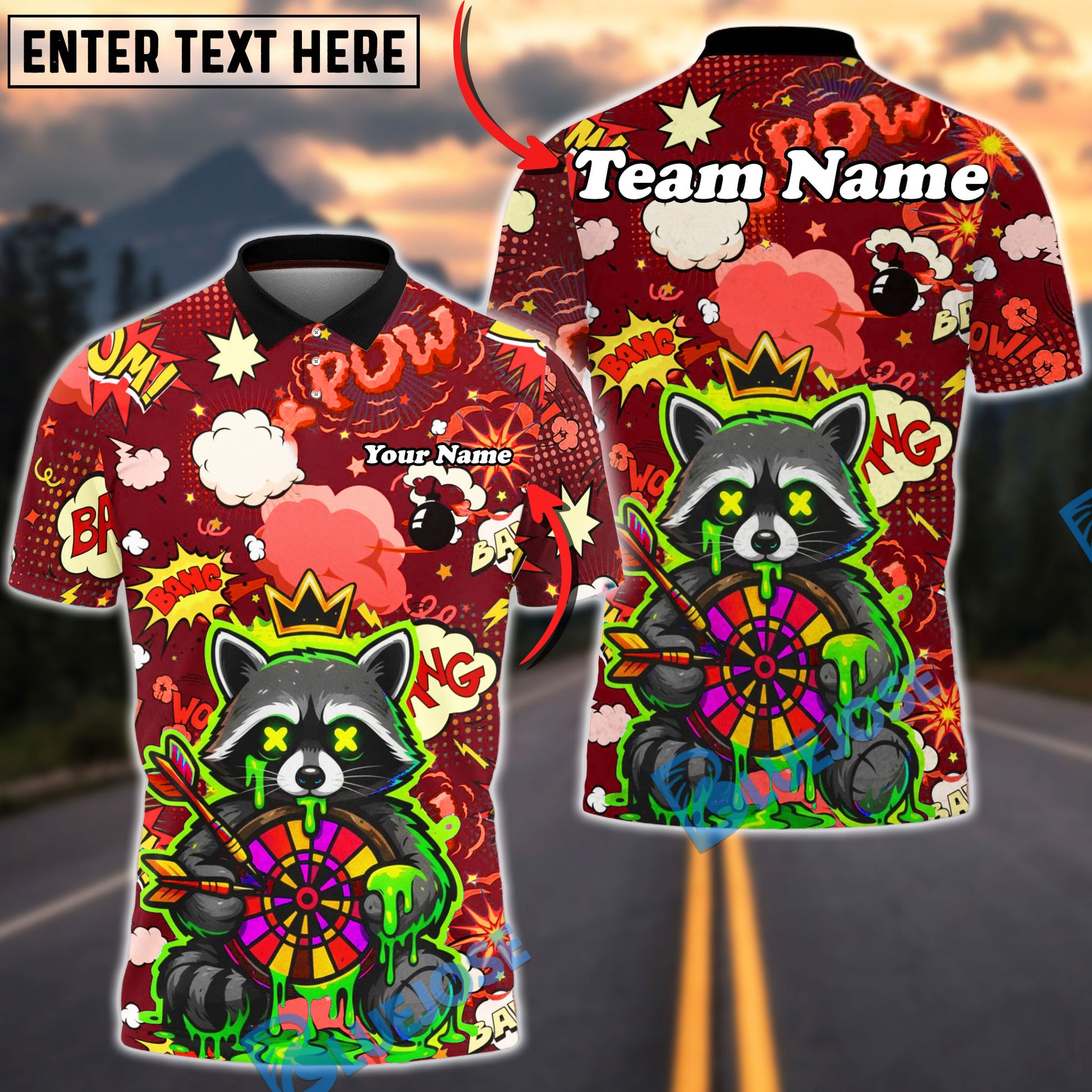 BlueJose Darts Raccoon Dartboard Comic Explosion Multicolor Options Personalized Name Shirt (4 Colors)