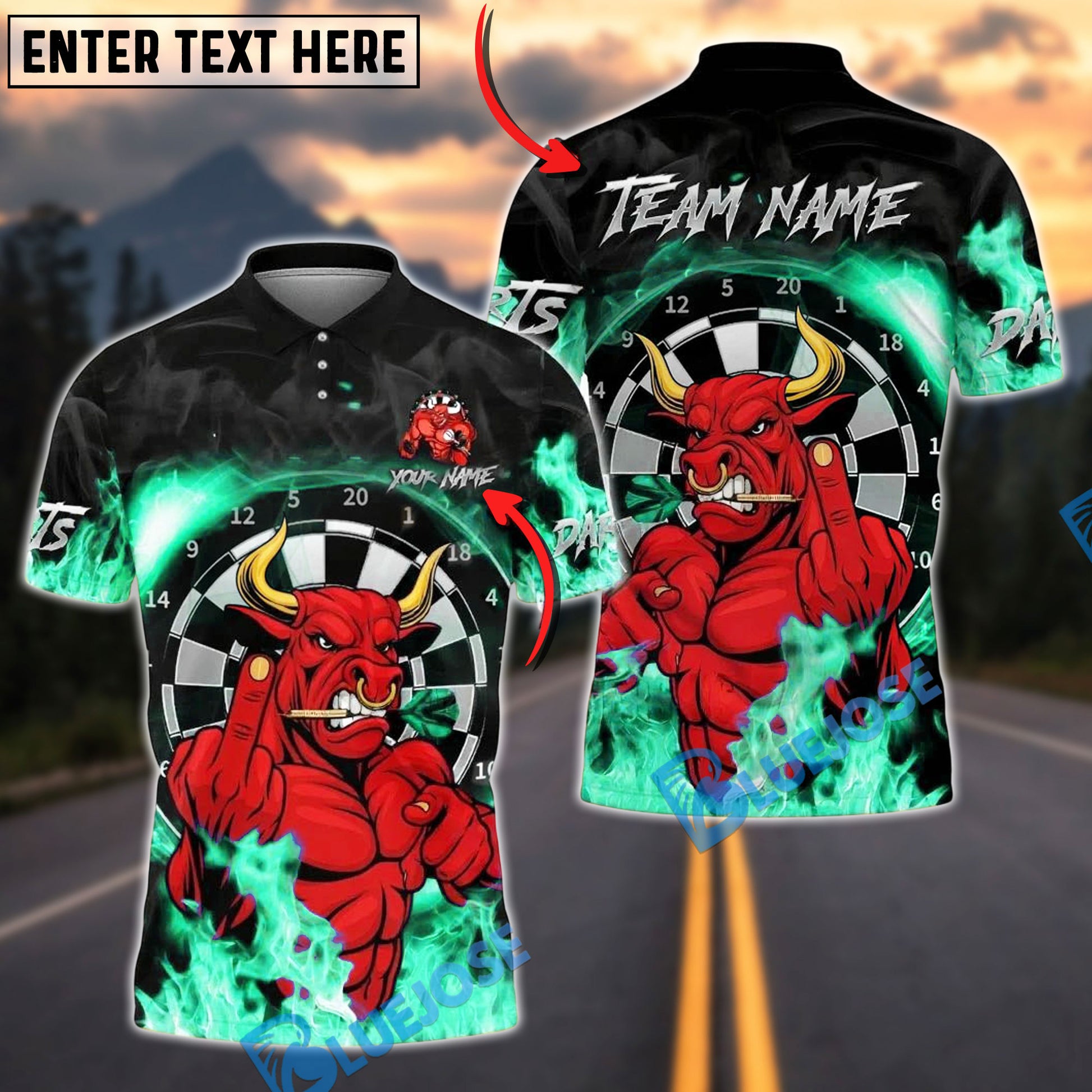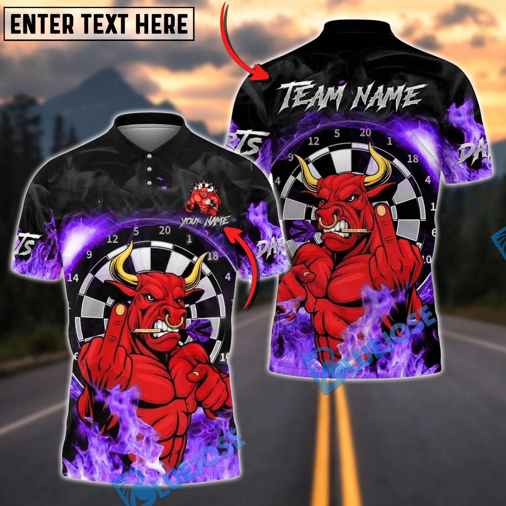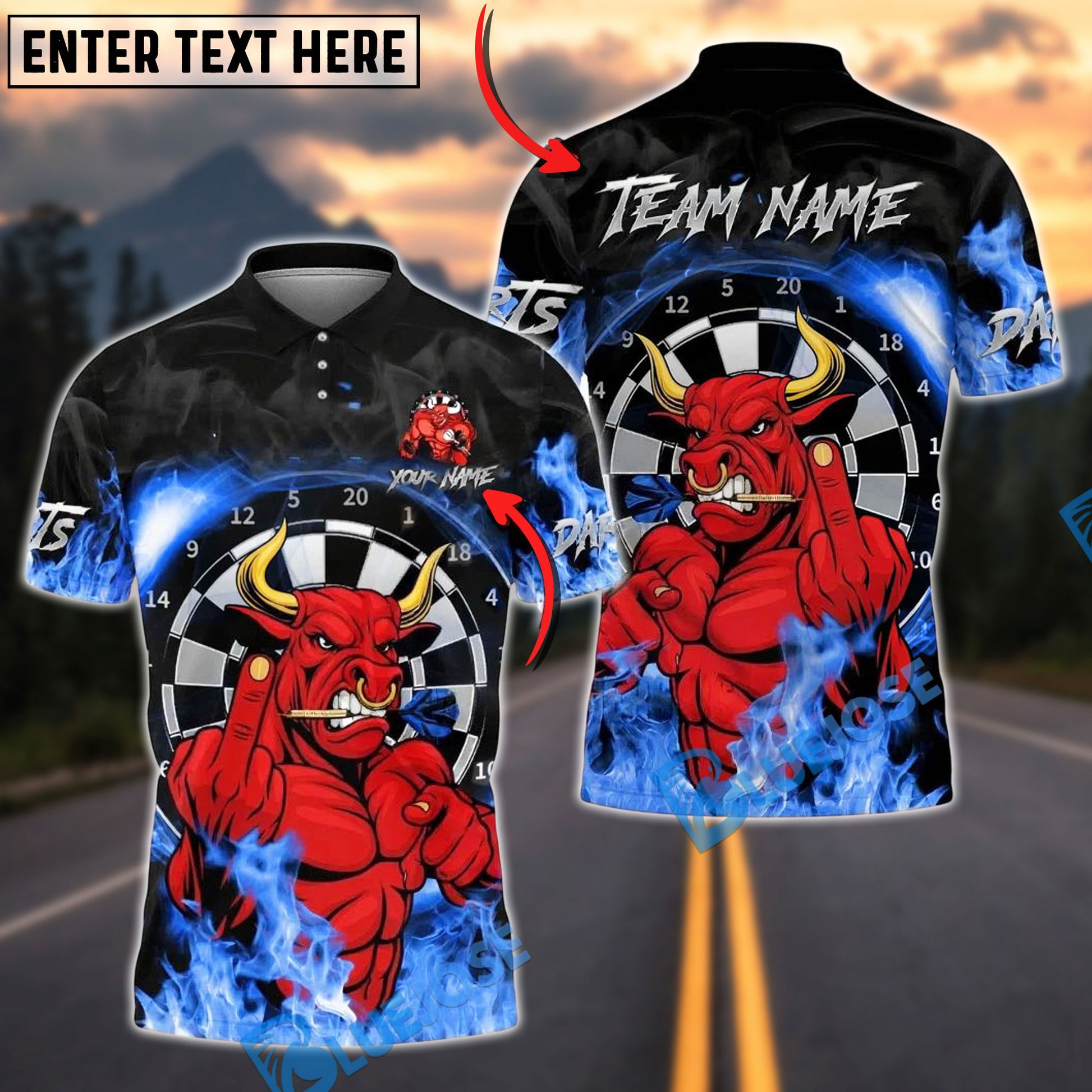 BlueJose Darts Red Bull Fire Personalized Name, Team Name Unisex Shirt (4 Colors)
