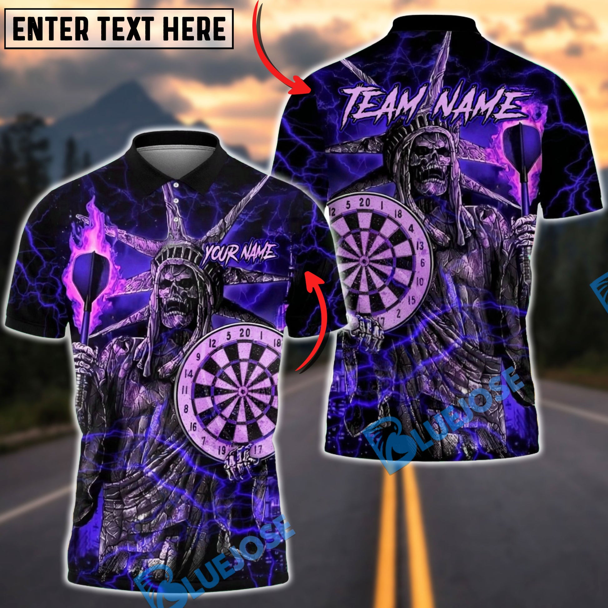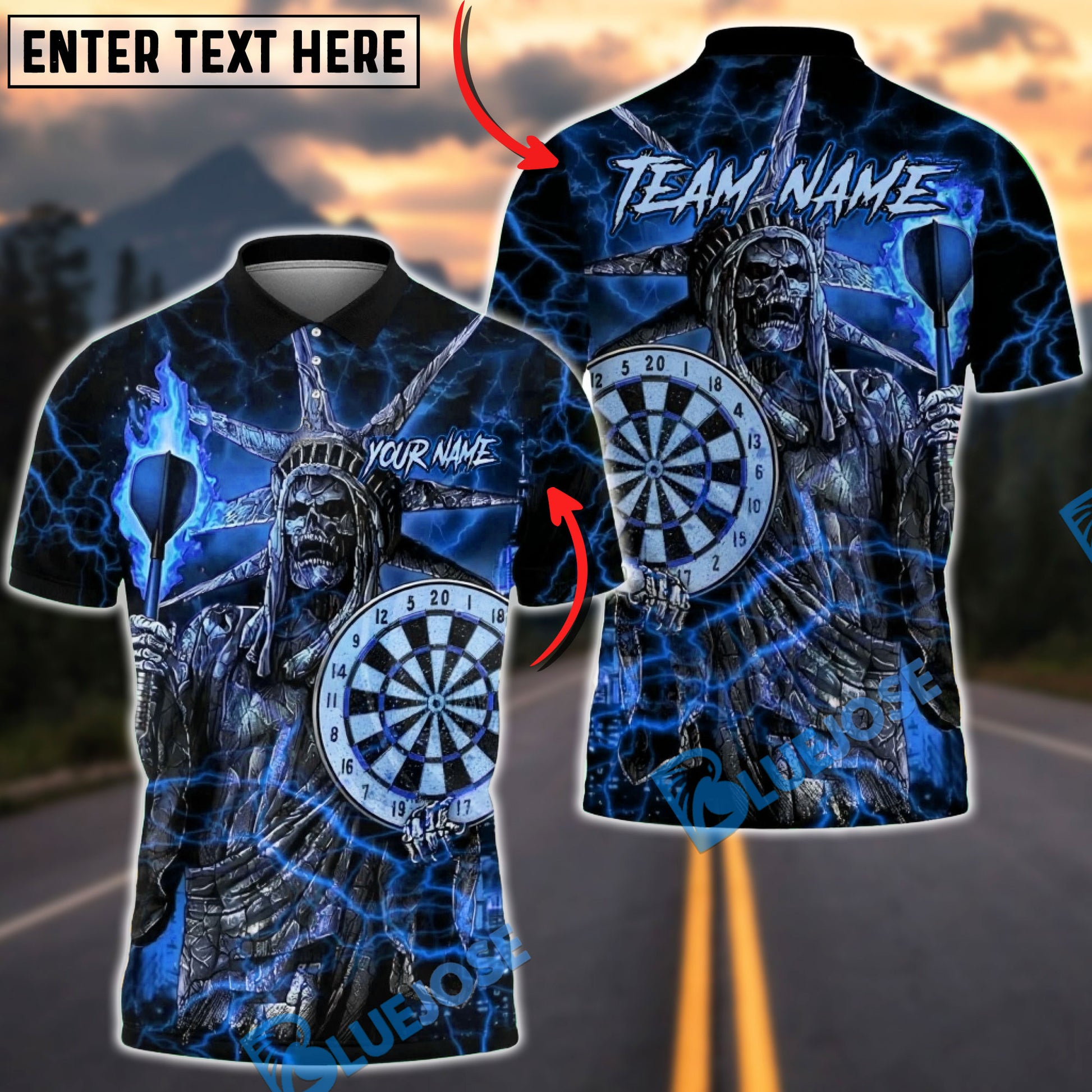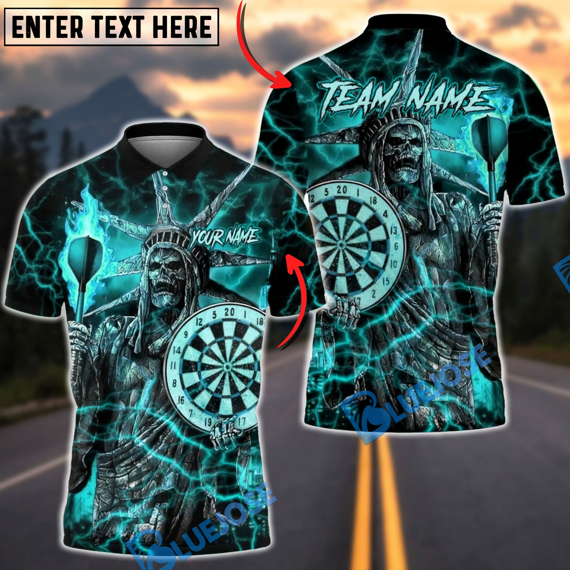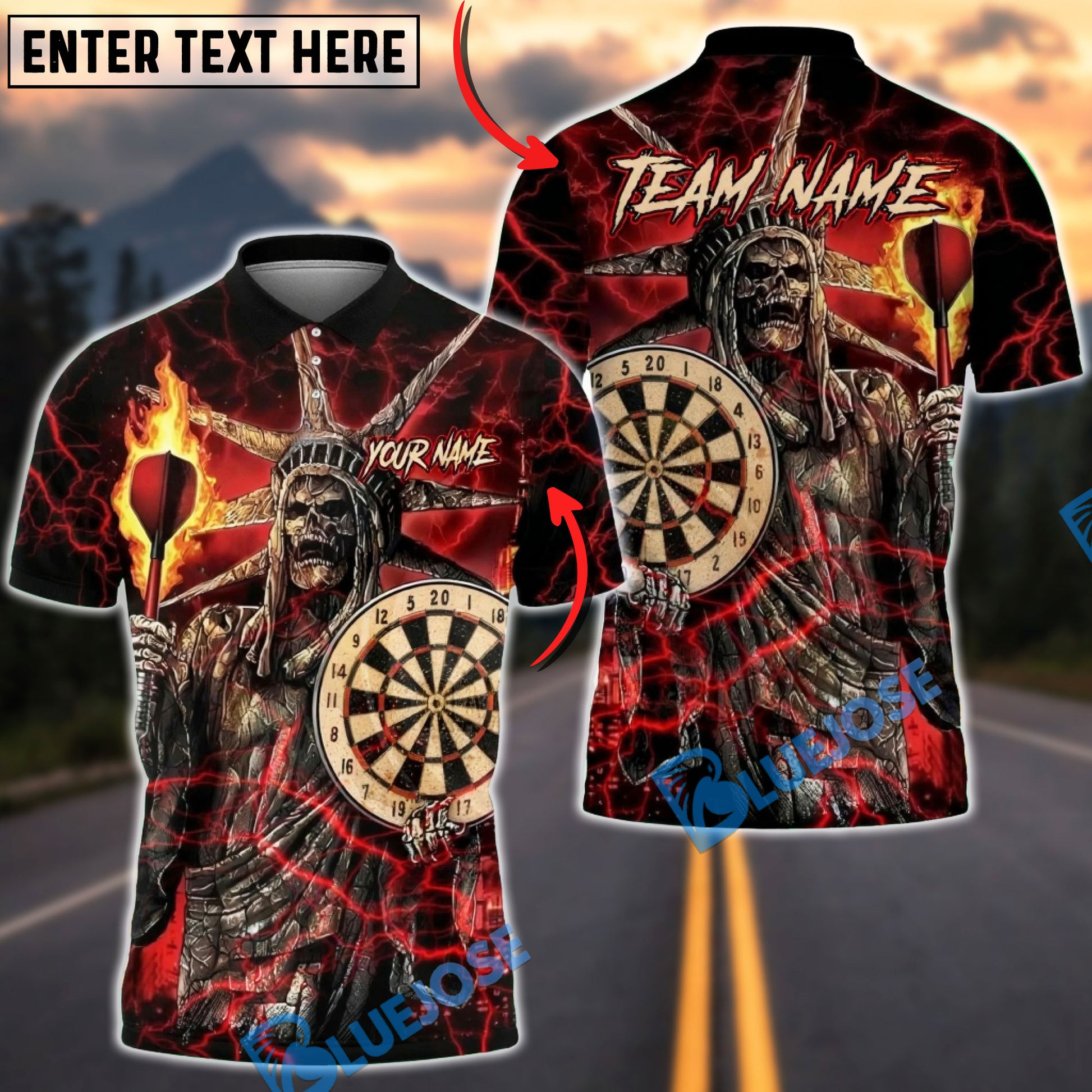 BlueJose Darts Statue of Liberty Skull Flame Multicolor Options Personalized Name Shirt (4 Colors)