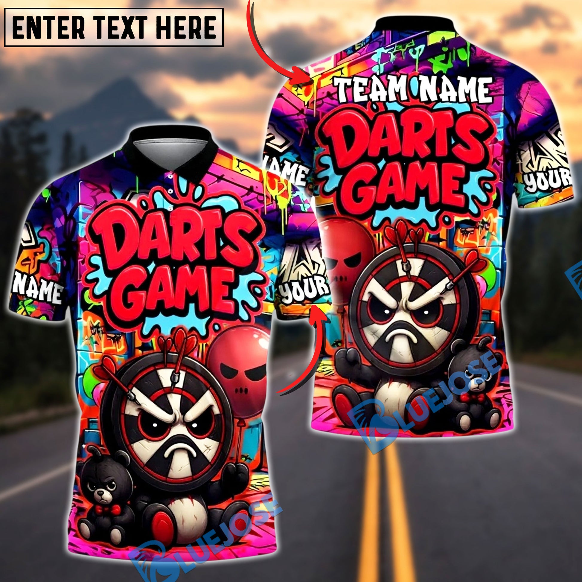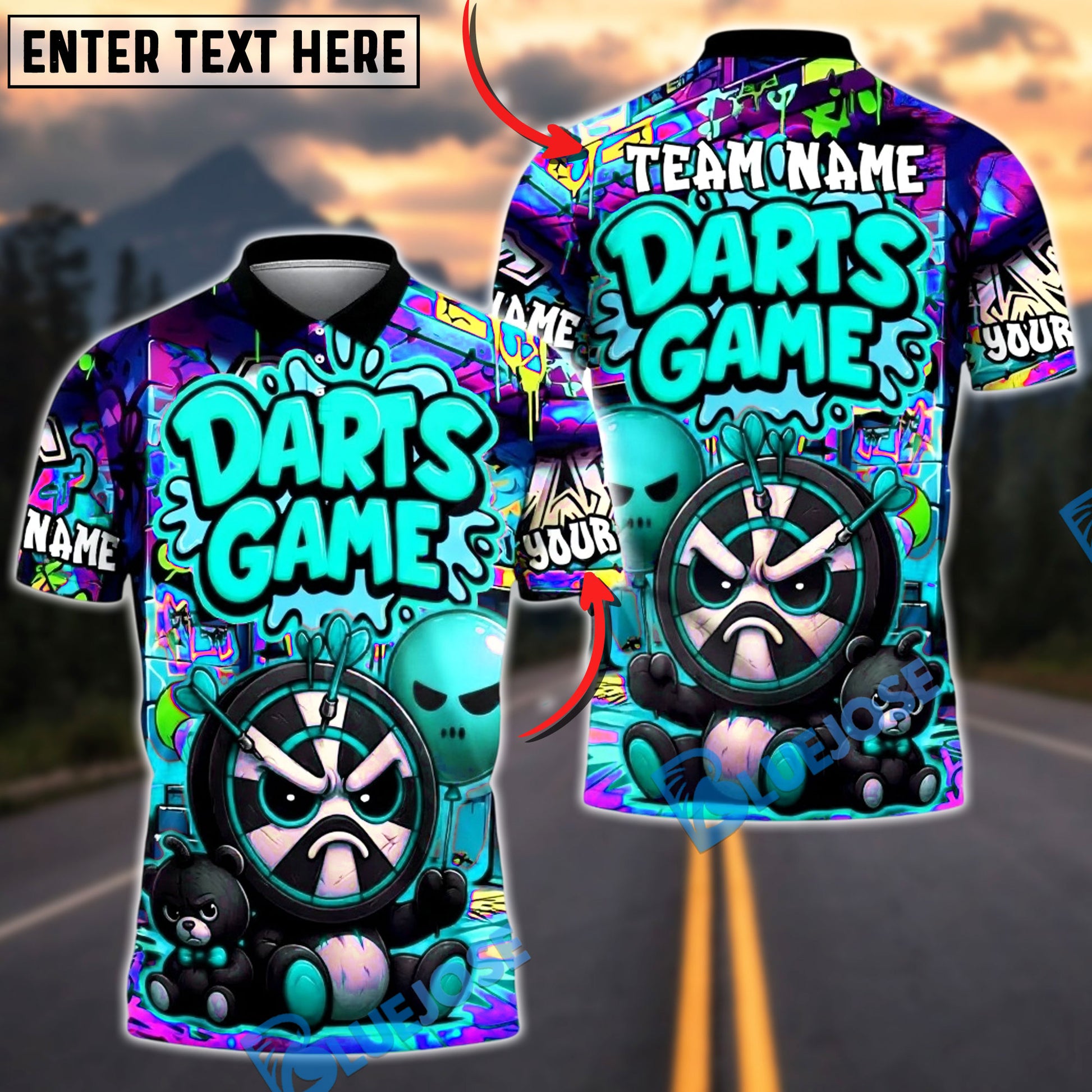 BlueJose Darts Street Graffiti Grumpy Mascot Personalized Name, Team Name Unisex Shirt (4 Colors)