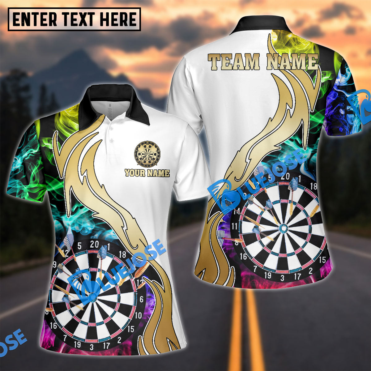 BlueJose Darts White Multicolor Golden Smoke Pattern Personalized Name Shirt
