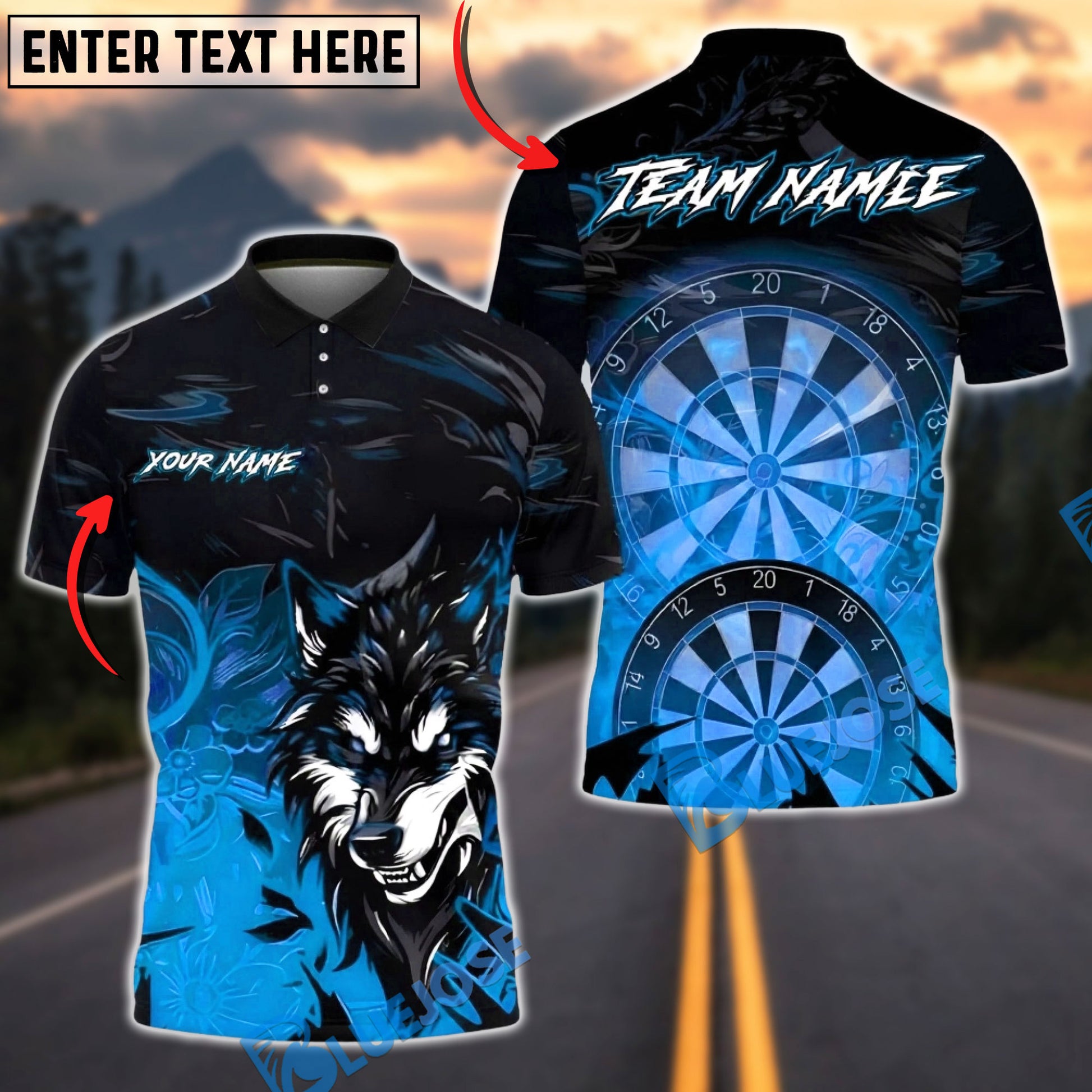 BlueJose Darts Wolf Smoke Design Multicolor Options Personalized Name Shirt (4 Colors)
