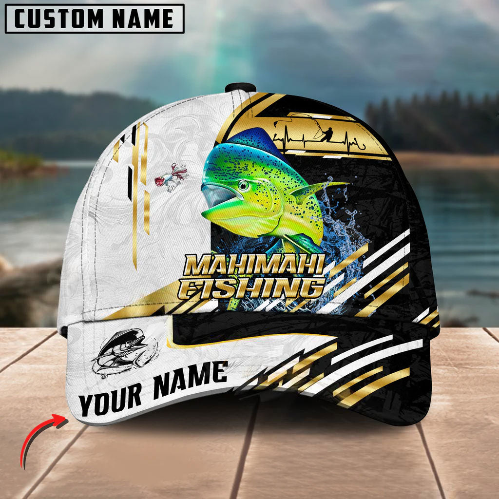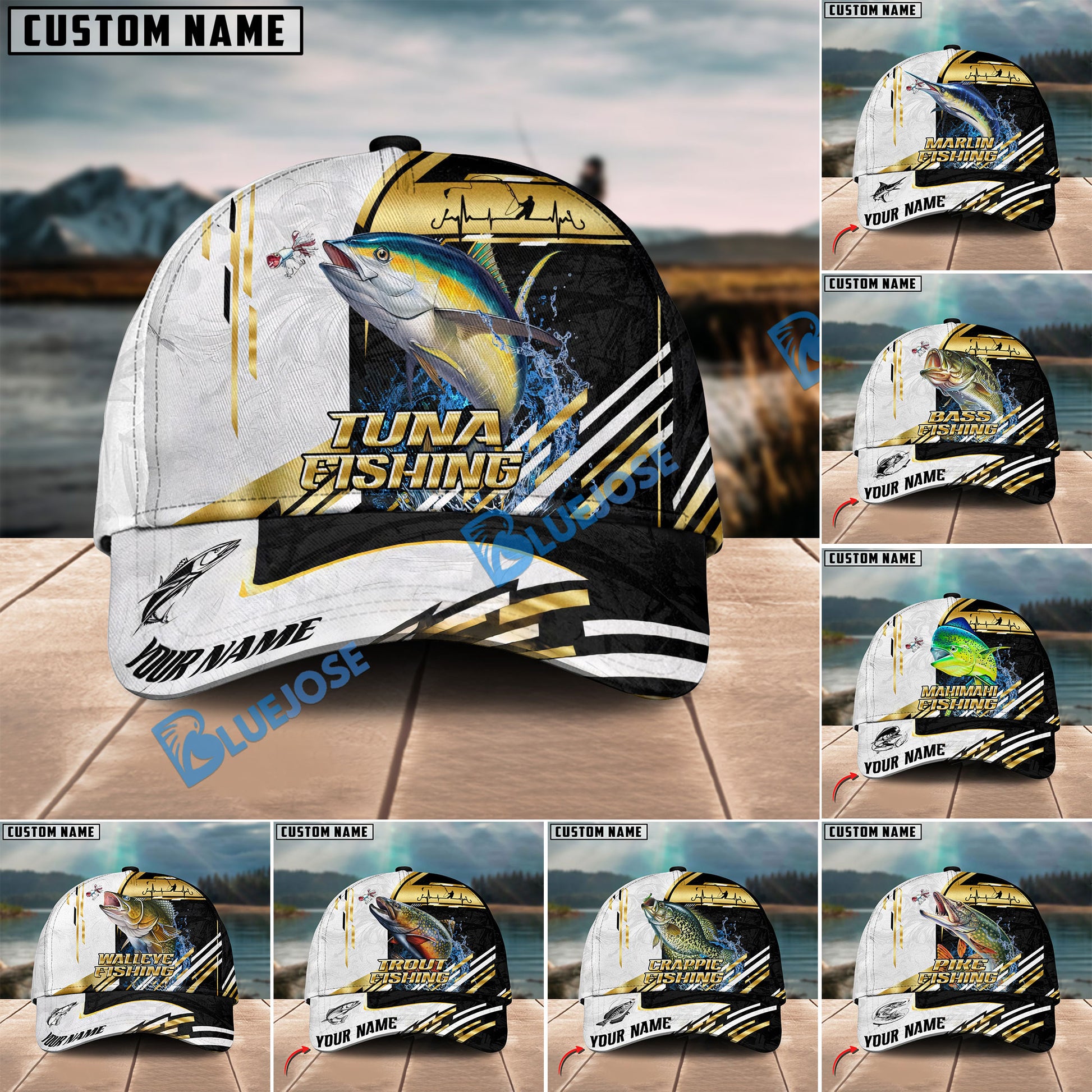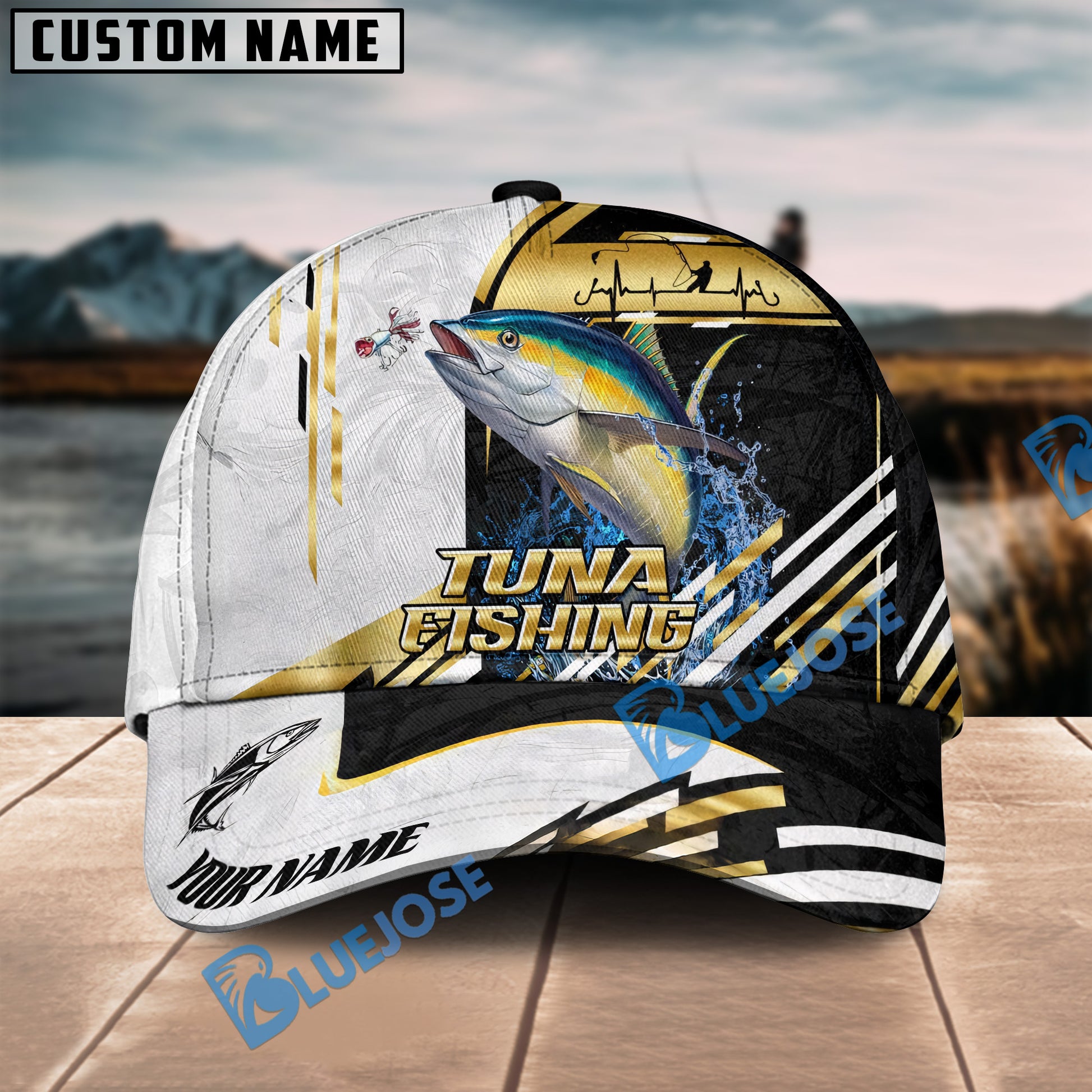 BlueJose Fishing Hook Graphic & Jumping Fish Art Personalized Cap (Tuna, Marlin, Mahi-Mahi, Pike, Bass, Walleye, Trout, Crappie)