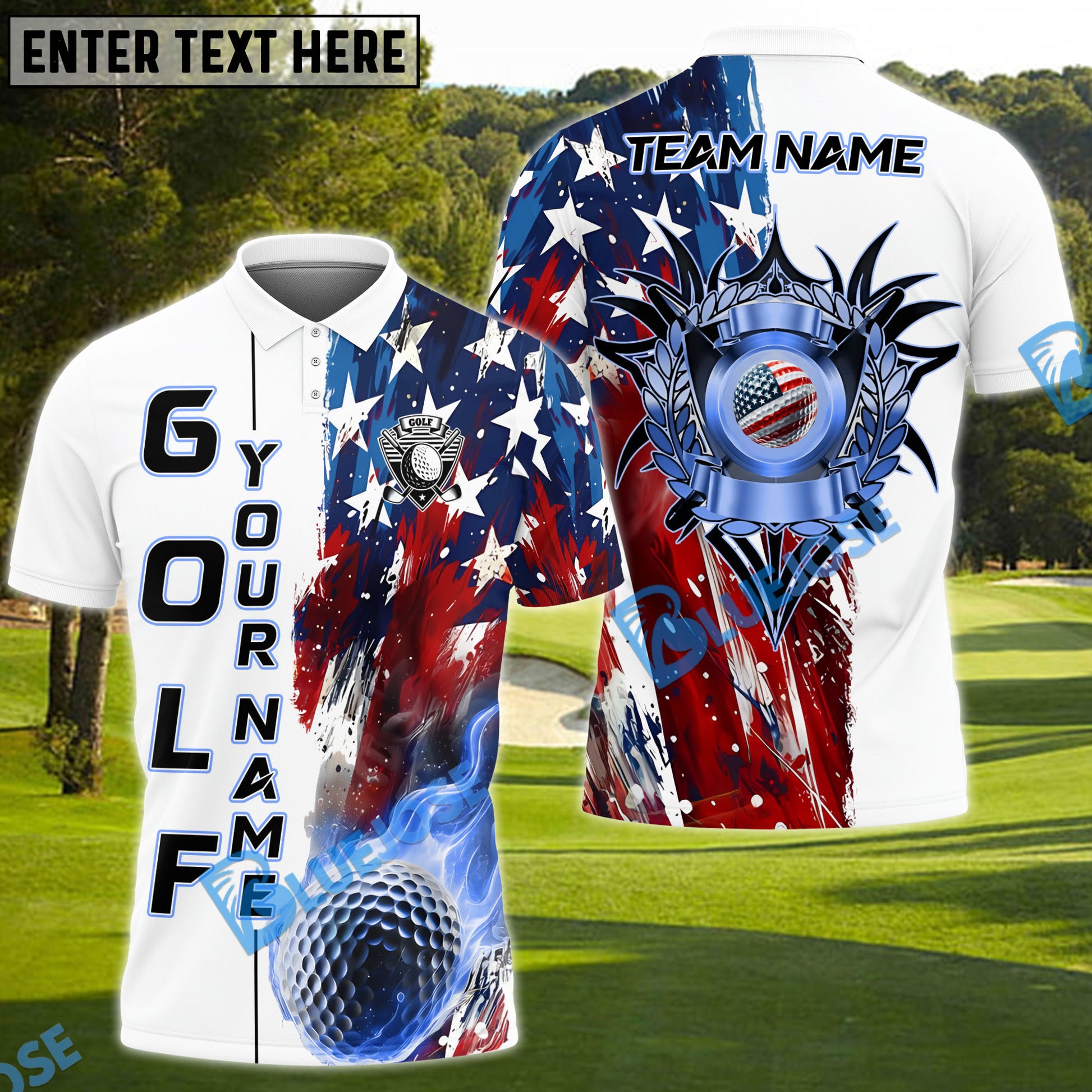 BlueJose Golf American Flag Flaming Ball Customized Name, Team Name 3D Shirts (4 Colors)