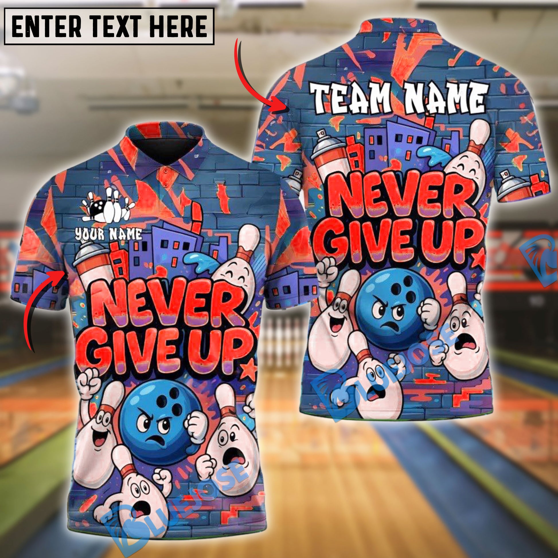 BlueJose Graffiti Bowling Ball & Pins Funny Never Give Up Customized Name, Team Name 3D Shirt (4 Colors)