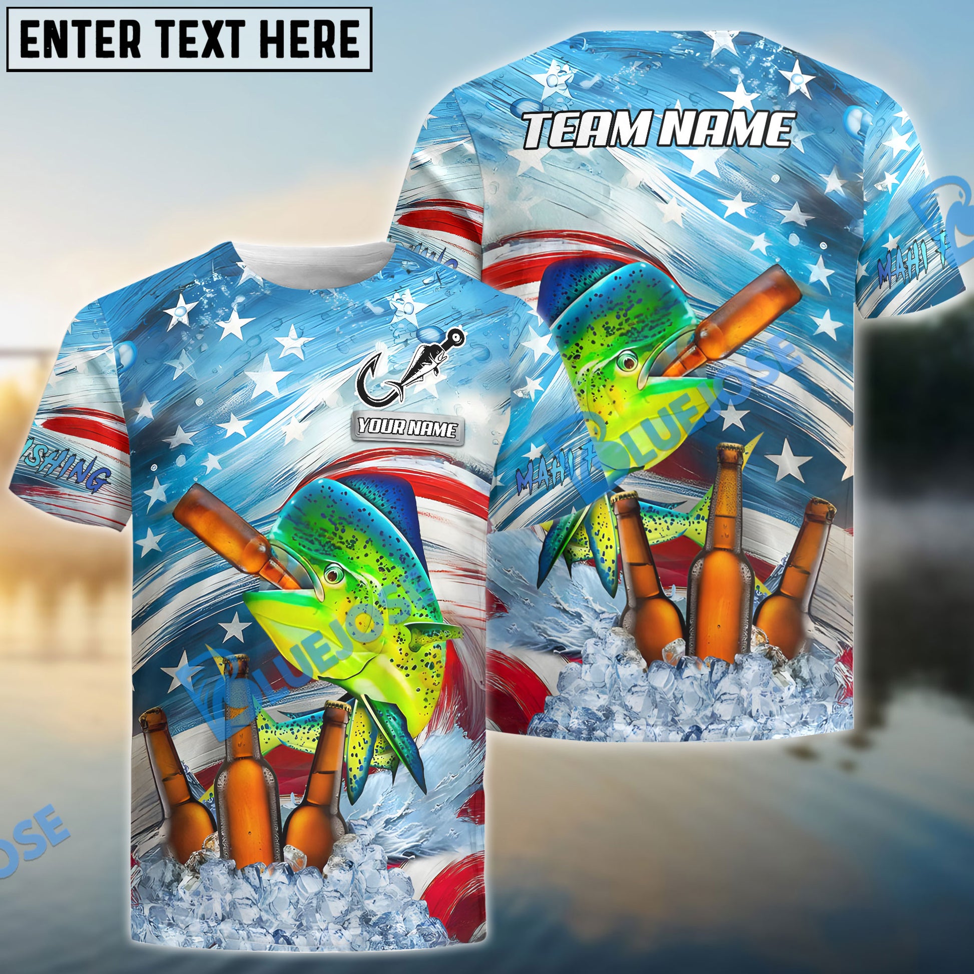 Bluejose Mahi-Mahi Fishing Beer & Usa Flag Graphic Custom Name & Team Name 3D Shirts
